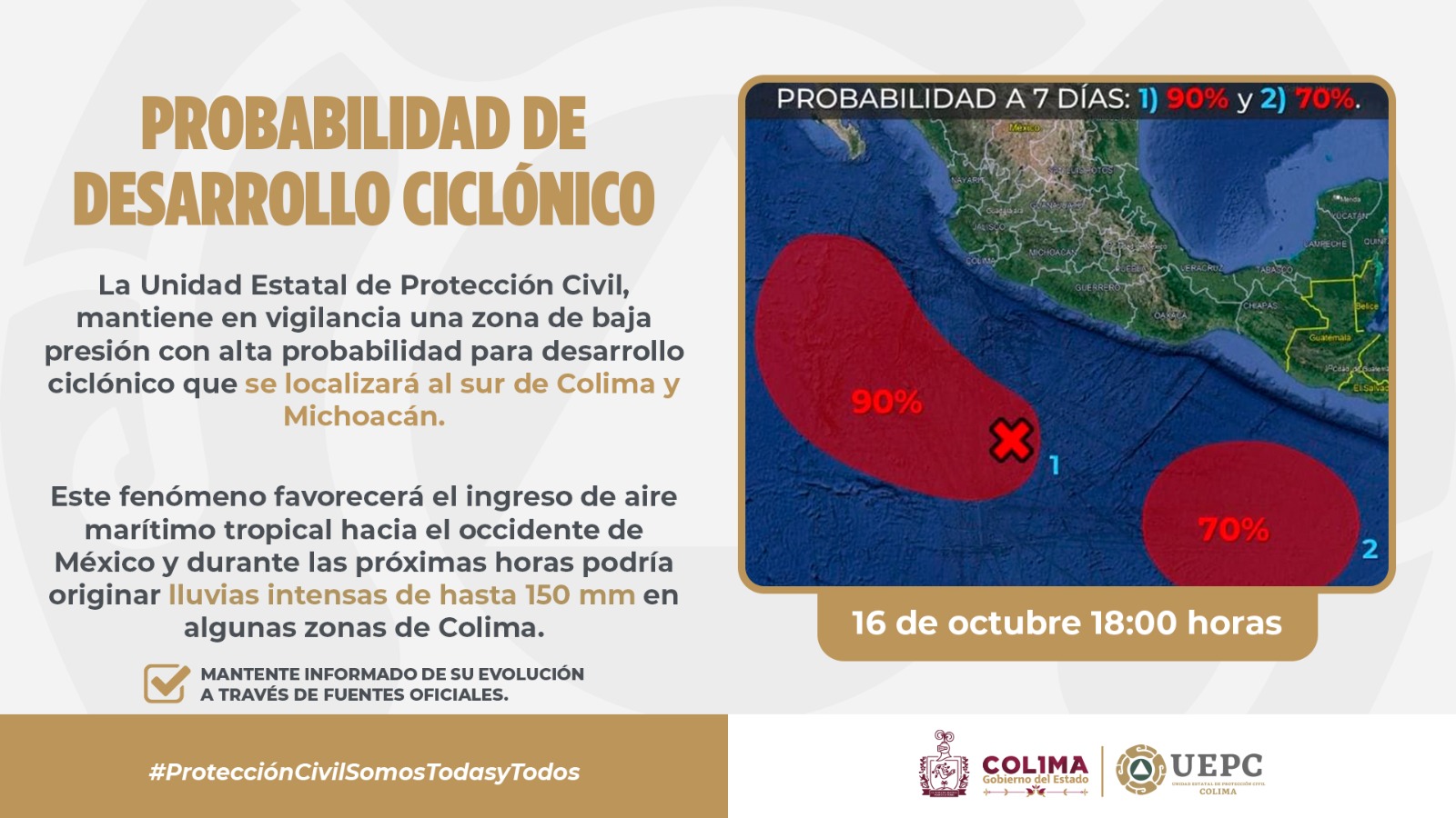 La Unidad Estatal de Protección Civil (UEPC) del Gobierno del Estado de Colima exhorta a la población a mantenerse informada de las condiciones climatológicas, así como de la evolución de dicho fenómeno hidrometeorológico.