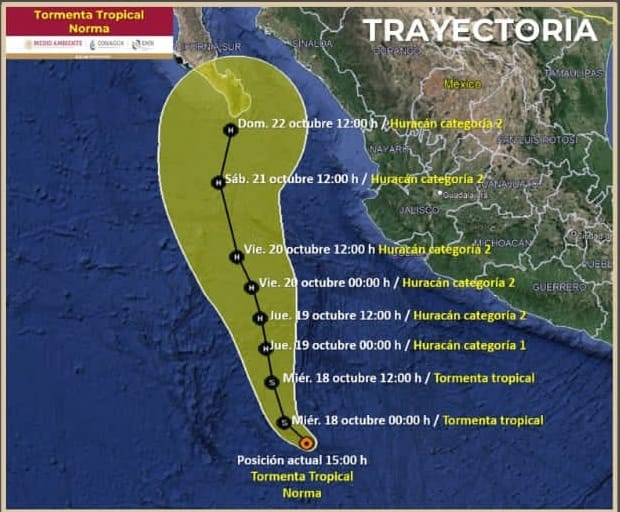 La tarde de este martes se formó la tormenta tropical ‘Norma’ al sureste de las costas de Michoacán y su centro se localiza a 720 kilómetros al sur-suroeste de Manzanillo, Colima, informó en reporte extraordinario de las 15 horas el Servicio Meteorológico Nacional (SMN), fuente oficial del Gobierno de México.