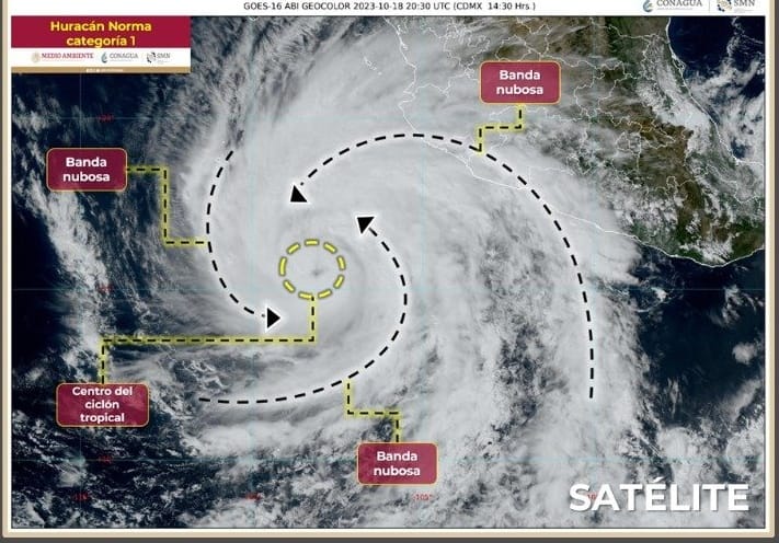 La tarde de este miércoles, la tormenta tropical ‘Norma’ se ha intensificado a Huracán categoría 1 en la escala Saffir-Simpson y su centro se localiza a 545 kilómetros al suroeste de Manzanillo, Colima, informó el Servicio Meteorológico Nacional (SMN), en su reporte extraordinario de las 15 horas.