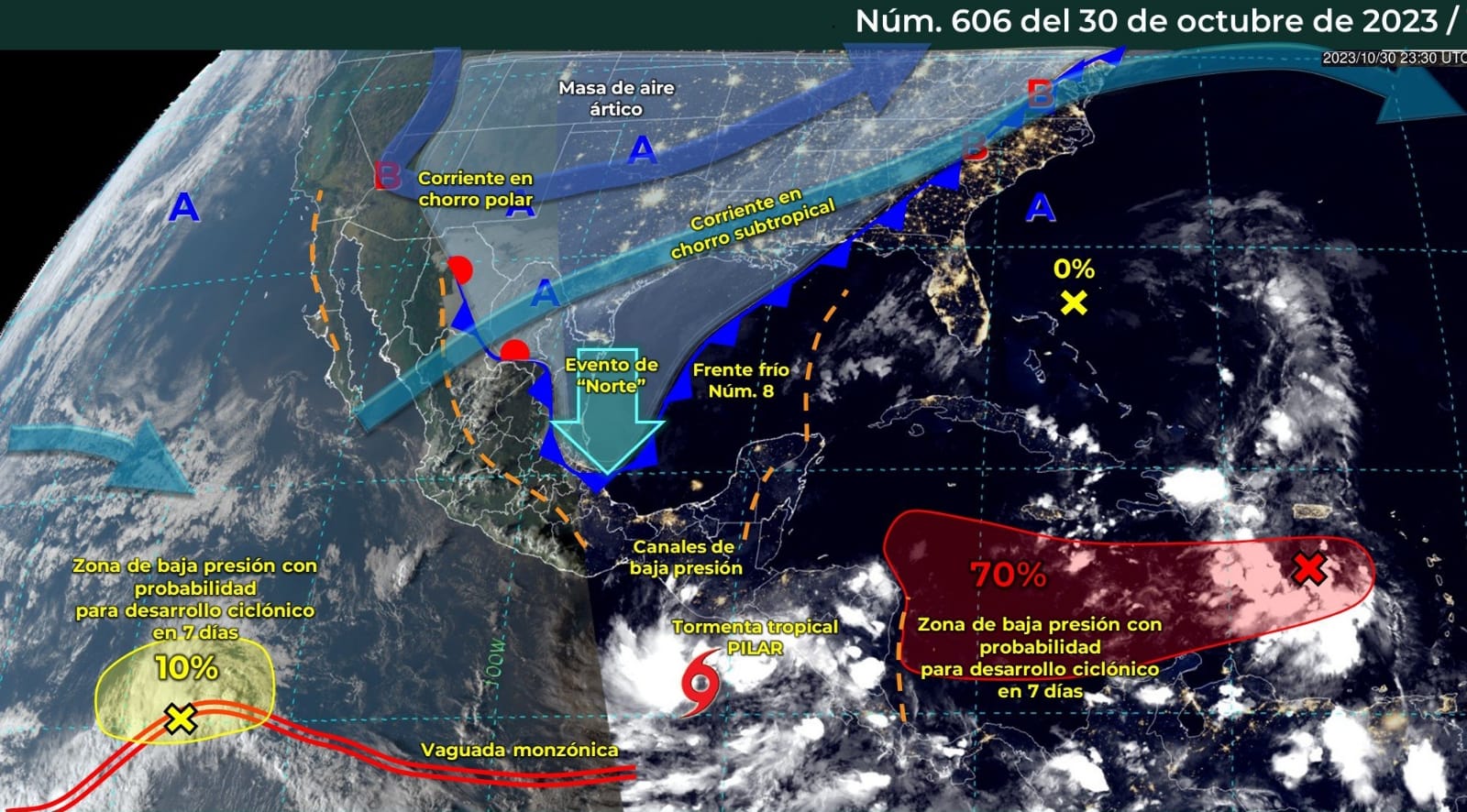 Para este martes 31 de octubre, el frente frío número 8 se extenderá desde el oriente del Golfo de México hasta el sureste del país, interaccionará con extensas bandas nubosas de la tormenta tropical ‘Pilar’, que se localizará al sur de las costas de Guatemala, manteniendo el pronóstico de lluvias intensas a puntuales torrenciales en zonas de Veracruz, Oaxaca, Chiapas y Tabasco.