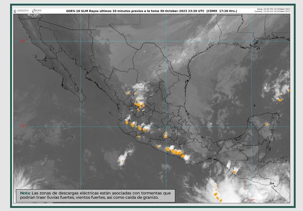 Durante las próximas horas, un canal de baja presión sobre el occidente de la República Mexicana y otro sobre la Península de Yucatán, además de la entrada de humedad de ambos litorales, originarán lluvias puntuales muy fuertes y descargas eléctricas en Yucatán y Quintana Roo, lluvias puntuales fuertes en *Colima*, Jalisco, Michoacán, Guerrero y Nayarit.