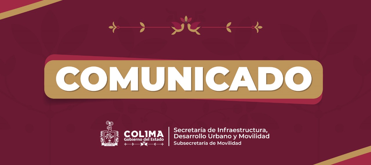 La Subsecretaría de Movilidad (Subsemov) del Gobierno del Estado de Colima, informa que, por causas ajenas a la dependencia, la circulación de la Dirección Regional Colima se encuentra bloqueada, y no es posible continuar con los trámites en estas oficinas.