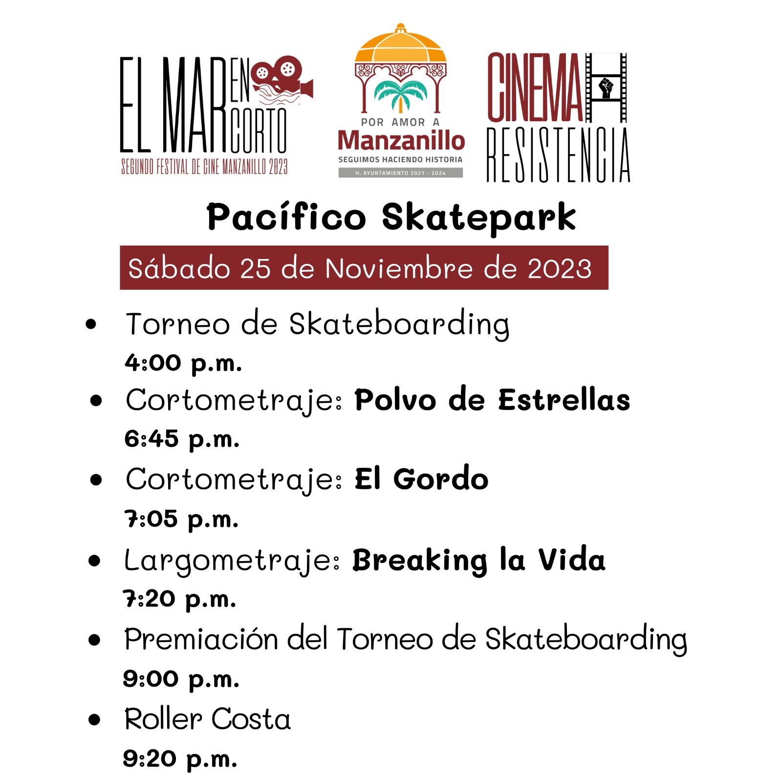 Para el sábado 25 de noviembre, la agenda de actividades comenzará a las 4 de la tarde con el torneo de skateboarding; a las 6:45 se proyectará el cortometraje, Polvo de estrellas; a las 7:05 El gordo; a las 7:20 el largometraje, Breaking la vida; a las 9 de la noche se realizará la premiación de las y los ganadores del torneo deportivo realizado y posteriormente, en la presentación estelar, estarán los Roller Costa.