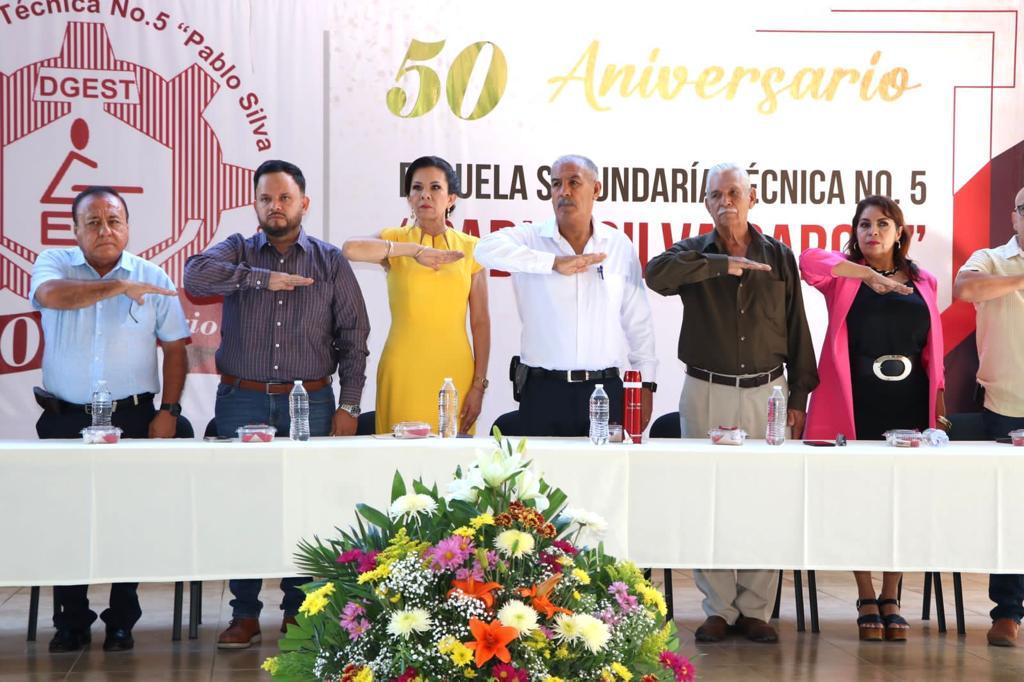 El secretario de Educación y Cultura del Gobierno del Estado de Colima, Adolfo Núñez González, presidió -en representación de la gobernadora Indira Vizcaíno Silva-, la ceremonia con motivo del 50 aniversario de la Escuela Secundaria Técnica No. 5 ‘Profesor Pablo Silva García’ del municipio de Comala.