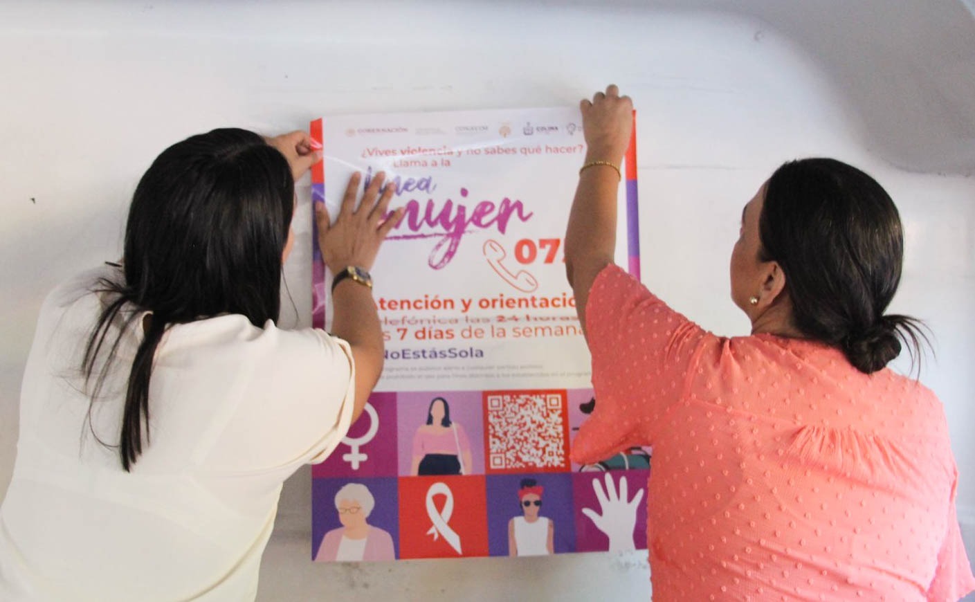 Los carteles incluyen información sobre la Línea Mujer 075, a la que pueden llamar las mujeres para recibir contención emocional y asesoría jurídica si viven violencia, y un QR que permite conocer la ubicación, teléfonos y horarios de los Centros de Atención Externa (CAE) del estado de Colima, donde se brinda orientación psicológica, jurídica y de trabajo social de manera gratuita.