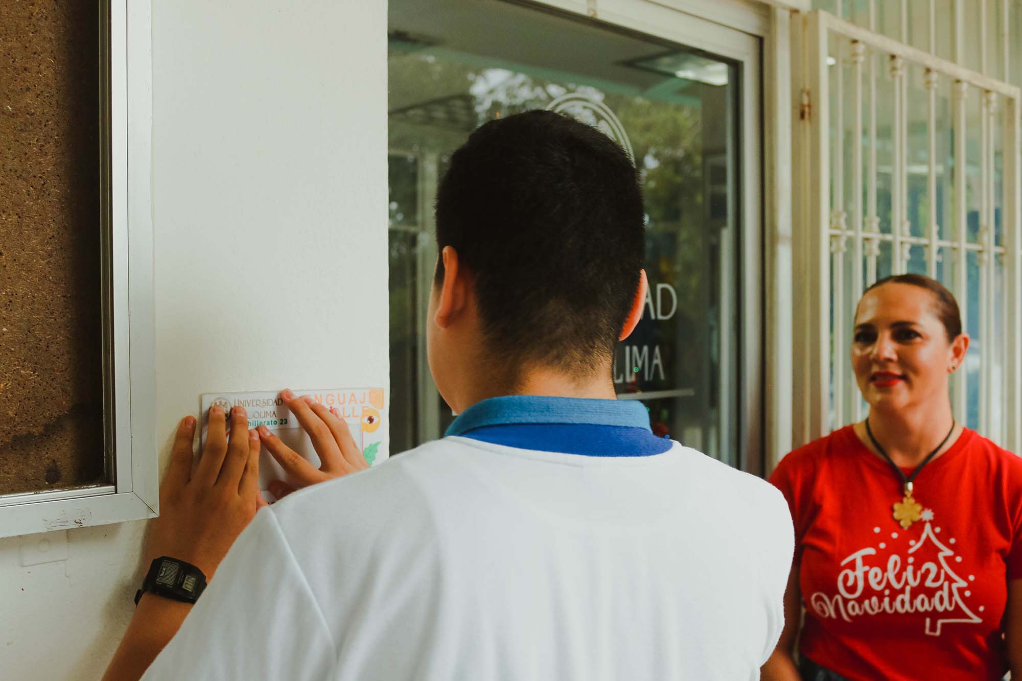 Hace seis meses, con la llegada del estudiante Ángel Gabriel, la comunidad académica del Bachillerato 23, en Santiago, Manzanillo, tomó conciencia de lo que es la discapacidad visual. Pronto, alumnas y alumnos se organizaron, con la asesoría del maestro Omar Melchor, responsable de la materia Gestión de Proyectos, para colocar placas con letreros en Braille en áreas importantes del plantel, como la dirección, aulas y baños.