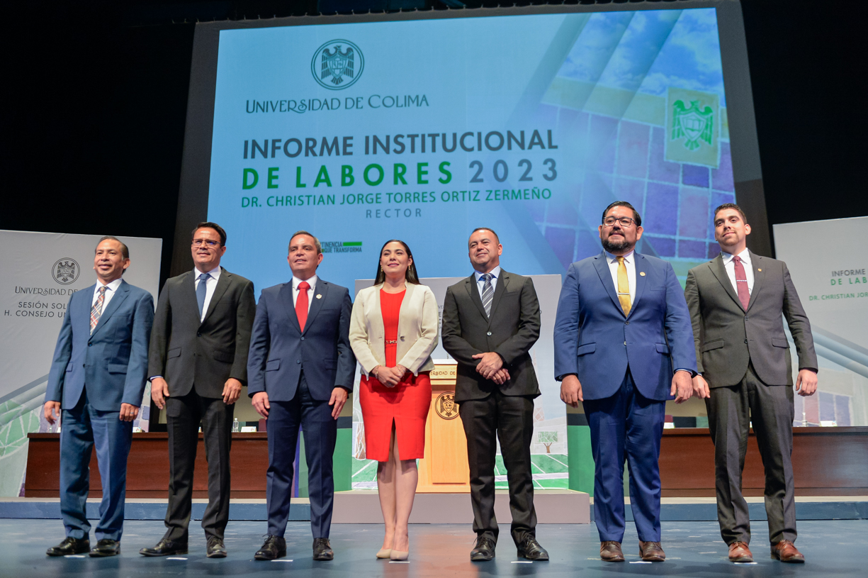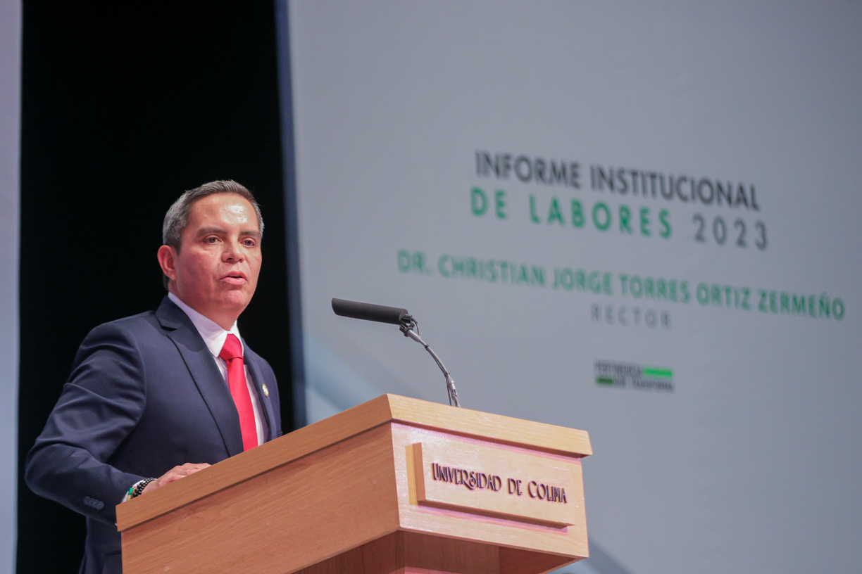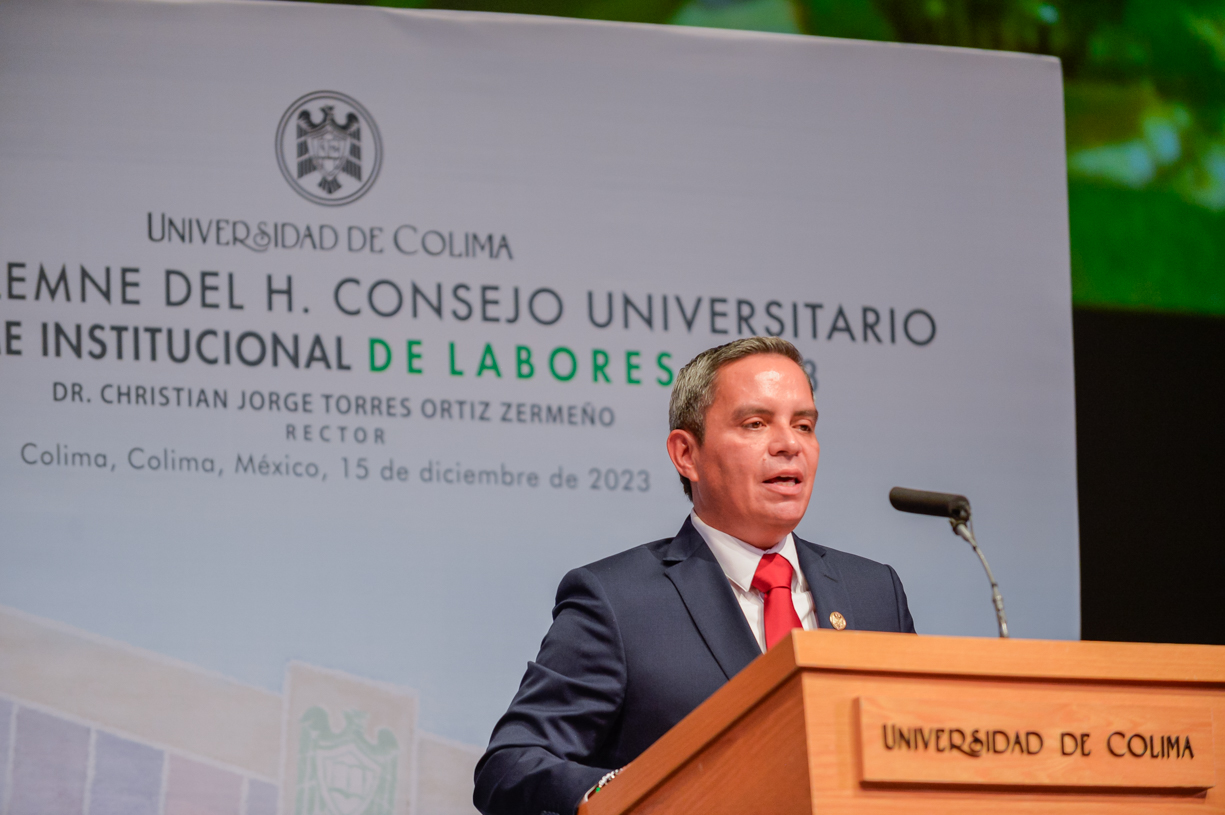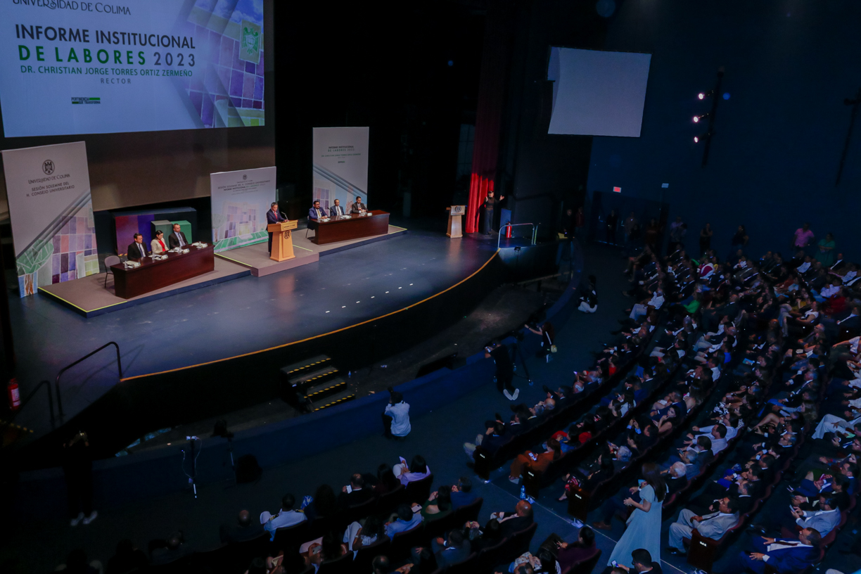 Ante un Teatro Universitario lleno de invitados y concejales integrantes del Consejo Universitario, máximo órgano de gobierno de la Universidad de Colima, el rector Christian Jorge Torres Ortiz Zermeño informó a la comunidad universitaria y la sociedad en general sobre las acciones más importantes realizadas por la institución educativa a lo largo de este 2023.