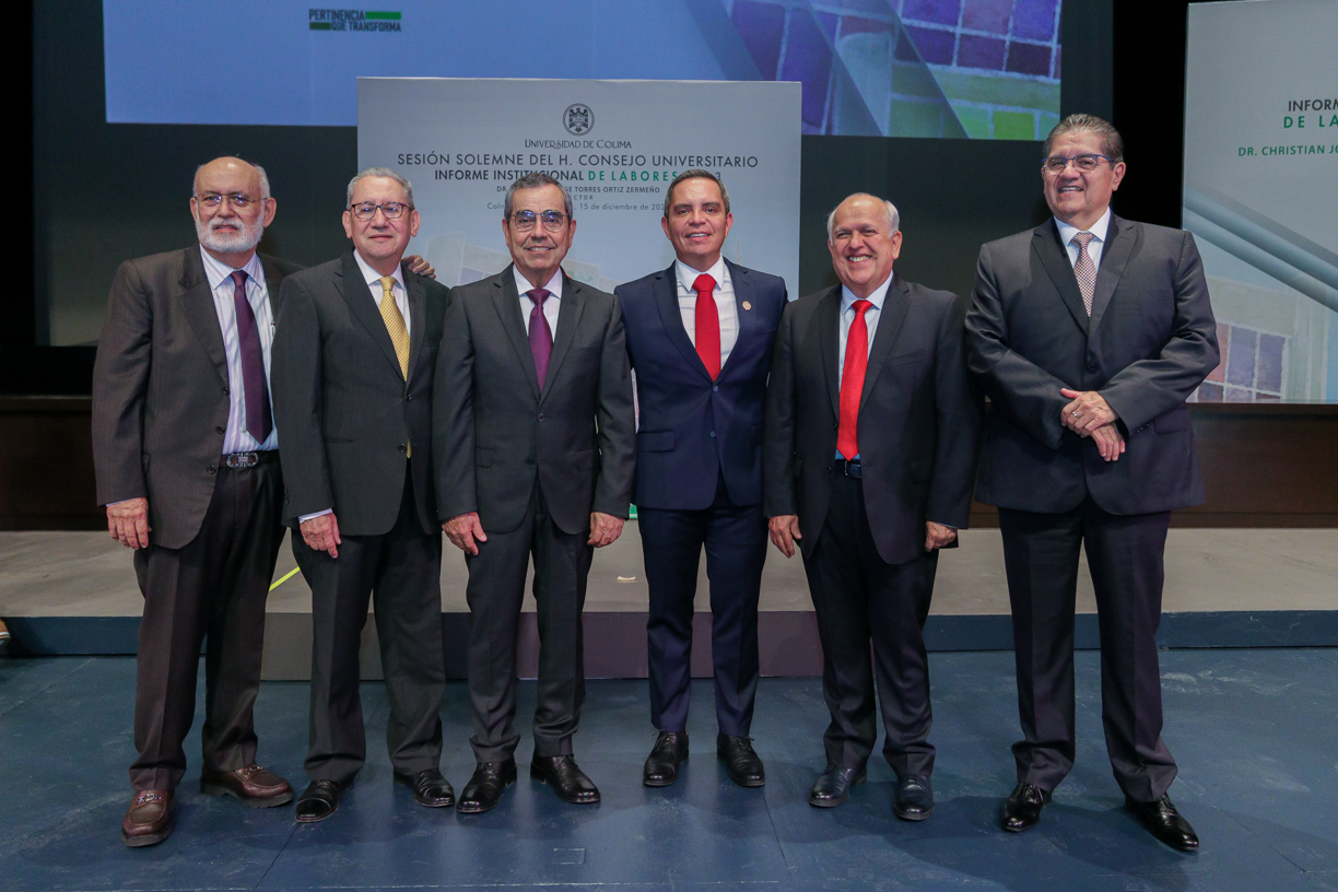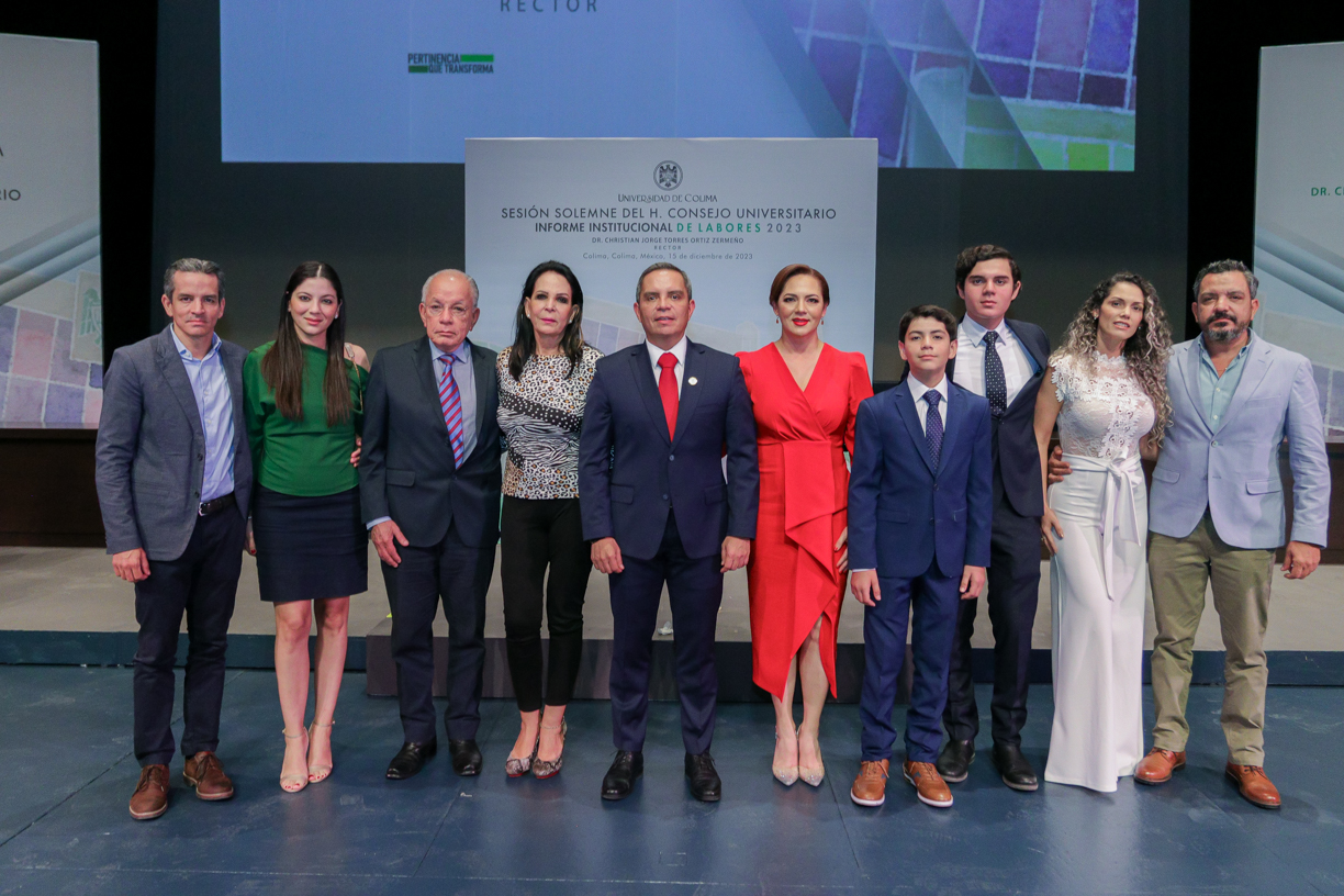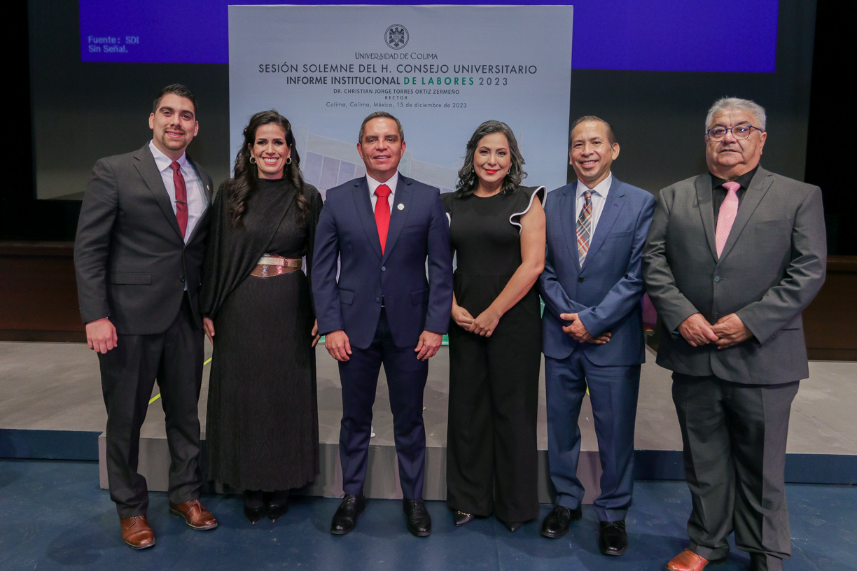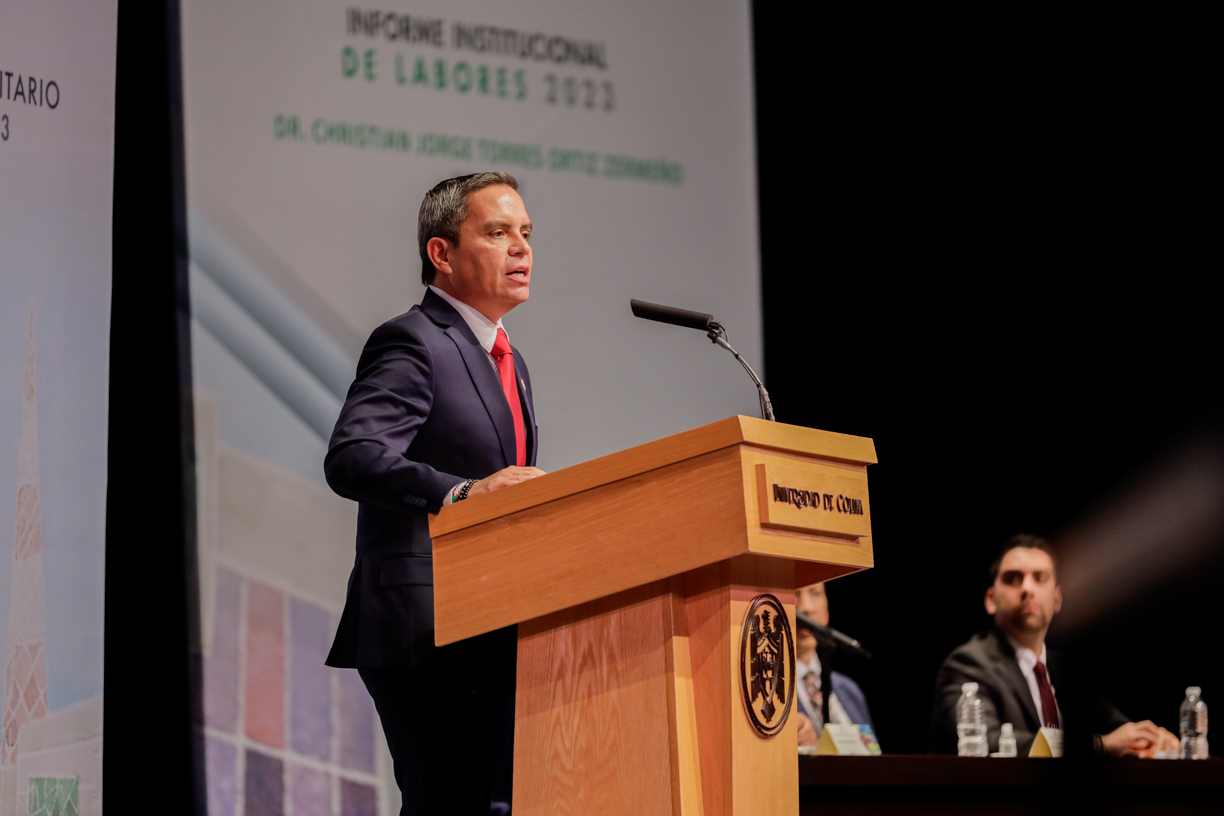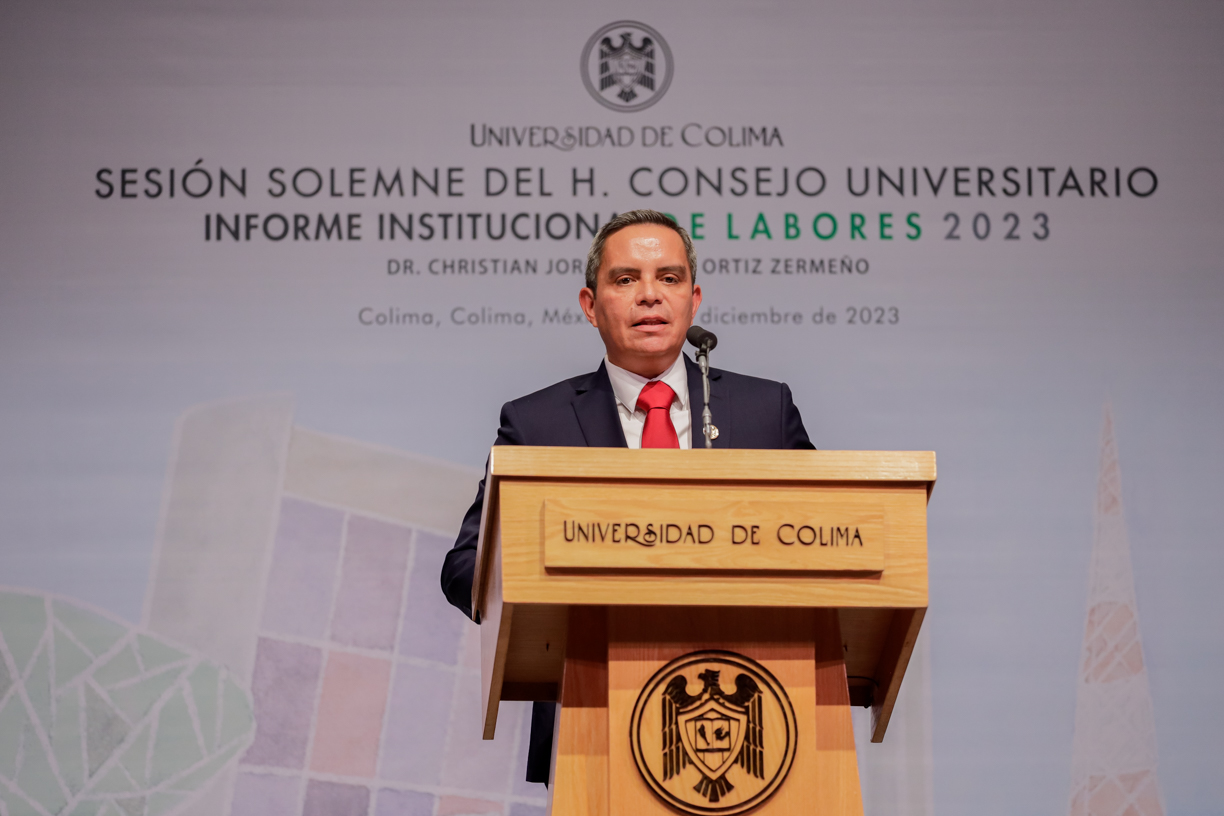 Ante un Teatro Universitario lleno de invitados y concejales integrantes del Consejo Universitario, máximo órgano de gobierno de la Universidad de Colima, el rector Christian Jorge Torres Ortiz Zermeño informó a la comunidad universitaria y la sociedad en general sobre las acciones más importantes realizadas por la institución educativa a lo largo de este 2023.