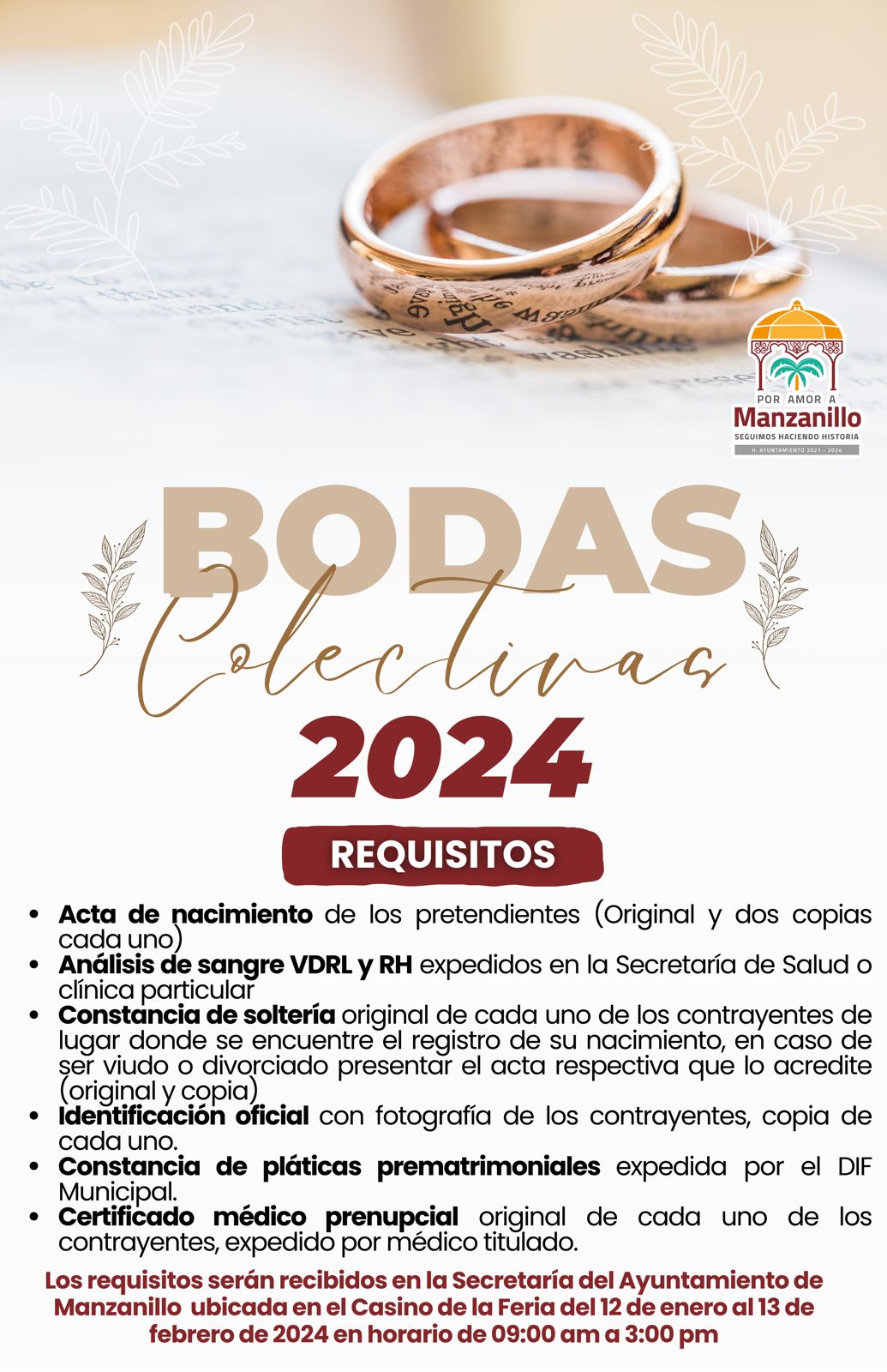 Para ser parte de esa gran lista de parejas, es necesario reunir requisitos, los cuales deberán entregarse en la Secretaría del Ayuntamiento Manzanillense.