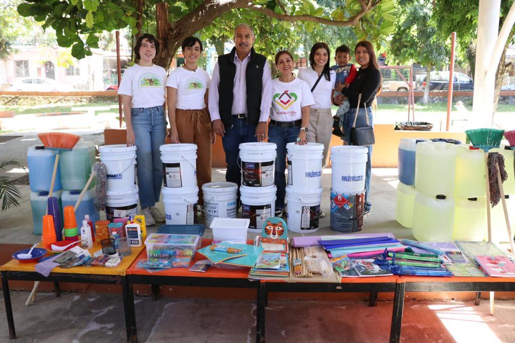 El titular de Educación Colima entregó once cubetas de pintura, material de limpieza, útiles escolares y materiales diversos para el Jardín de Niños “Enriqueta Velázquez León” en Cofradía de Suchitlán, municipio de Comala; así como cuatro mesas de trabajo con sus respectivas sillas para el Centro de Atención Múltiple (CAM) “Ricardo de Jesús Vázquez Lara Centeno”, en Villa de Álvarez.