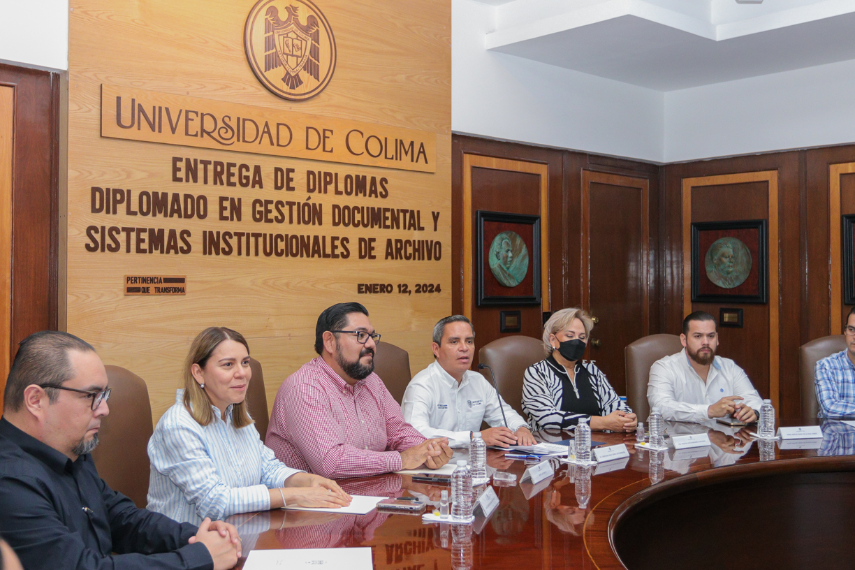 El rector Christian Torres Ortiz Zermeño entregó diplomas a 26 participantes que concluyeron el Diplomado en Gestión Documental y Sistemas Institucionales de Archivo, que realizó desde mediados de agosto del año pasado la Universidad de Colima.
