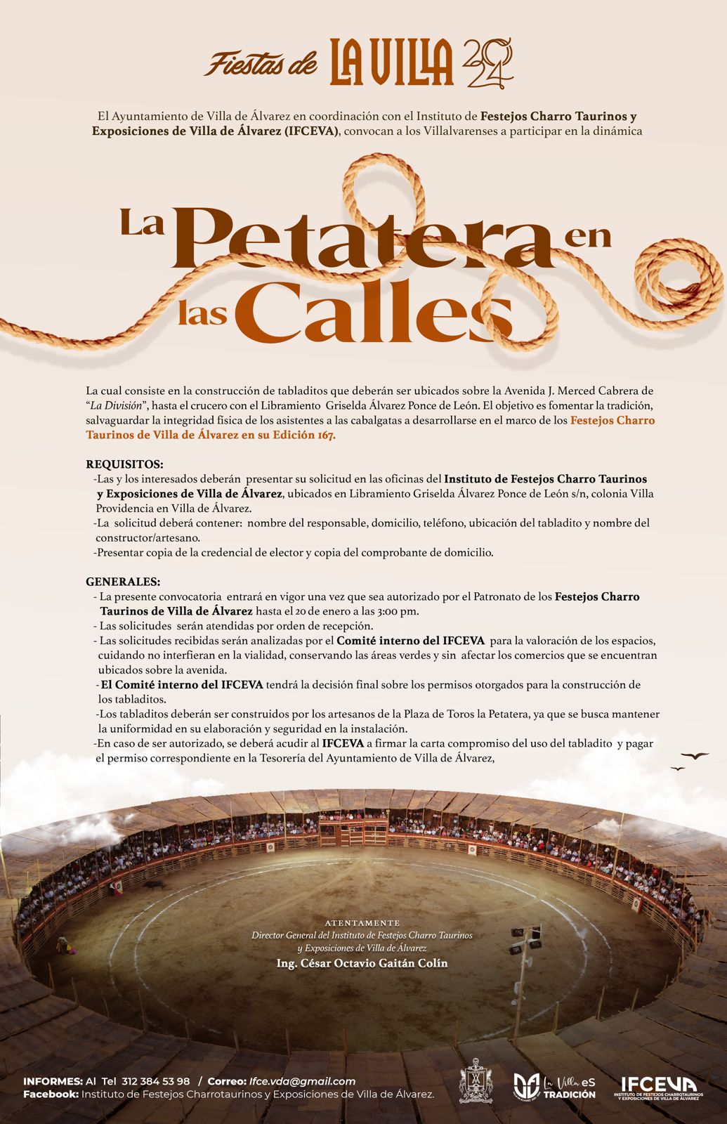 Comentó que las personas interesadas deberán presentar la solicitud en las oficinas del Instituto de Festejos Charro Taurinos y Exposiciones de Villa de Álvarez, con el nombre del responsable, domicilio, teléfono, ubicación del tabladito y nombre del constructor, así como la copia de la credencial de elector y copia del comprobante de domicilio.