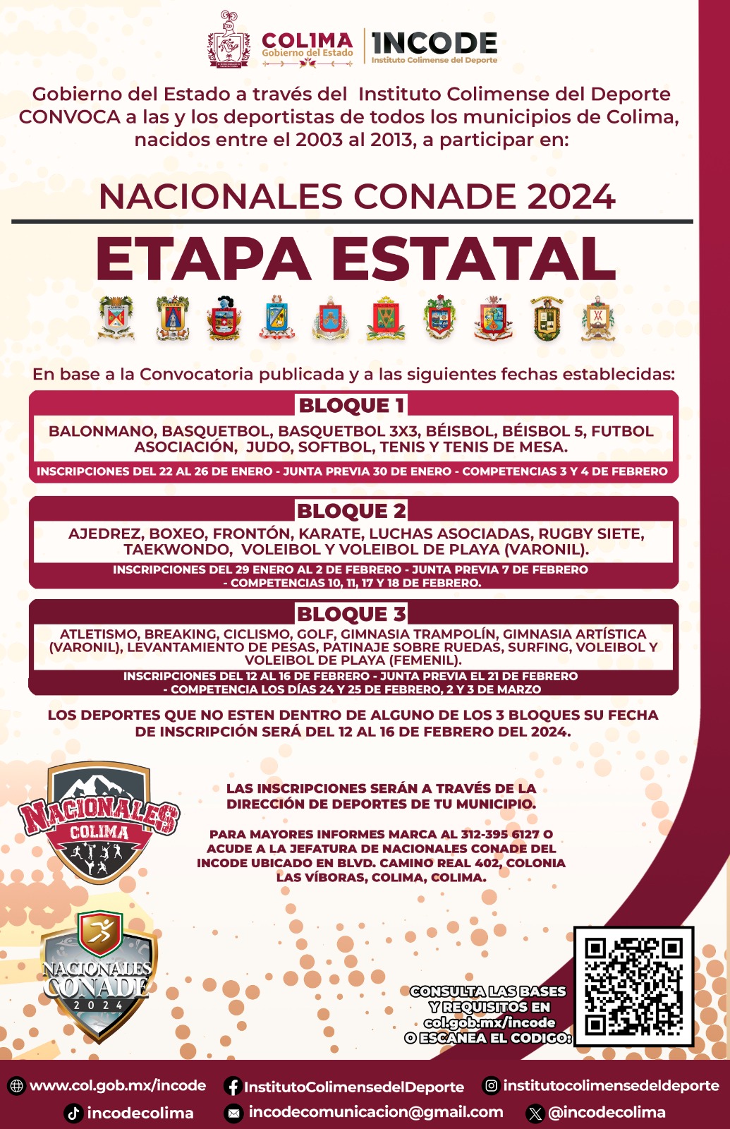Podrán consultar y descargar las bases y requisitos de esta convocatoria, además de los formatos y cedulas de inscripción, en la página www.col.gob.mx/incode o si requieren mayor información, marcar al teléfono 312-395-6127 o acudir a la Jefatura de Nacionales Conade del Incode en boulevard Camino Real 402, colonia Las Víboras, en la ciudad de Colima.