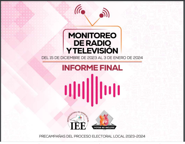 Lo anterior se refleja en el Informe Final del Monitoreo presentado este martes 30 de enero durante la Octava Sesión Ordinaria del Proceso Electoral Local, en cumplimiento con la Metodología y el Catálogo de programas de radio y televisión para el monitoreo de precampañas y campañas, aprobados por el Consejo General mediante los Acuerdos IEE/CG/A004/2023 e IEE/CG/A005/2023.