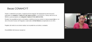 Sánchez Espinoza explicó que en agosto de 2023 se establecieron nuevas temáticas para el apoyo a los programas de posgrado y sus estudiantes. “Hay que tener mucho cuidado porque podemos tener programas registrados ante SNP, pero que no son elegibles para que sus estudiantes soliciten una beca de posgrado”.