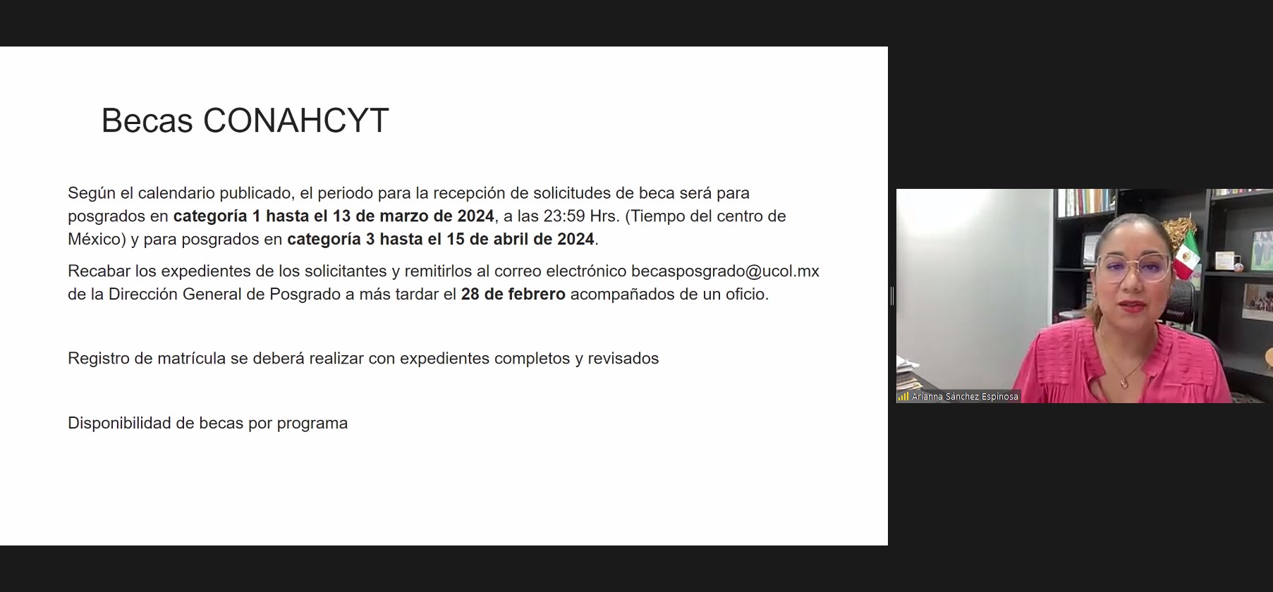Comentó que están próximos a un proceso de admisión al posgrado: “cuidemos este proceso, que sea transparente, objetivo, justo y dinámico; eso nos da tranquilidad, certeza y nos evita problemas. Recuerden que el resultado del proceso determina la prelación del orden de cada uno de los aceptados puede aspirar a una beca”.