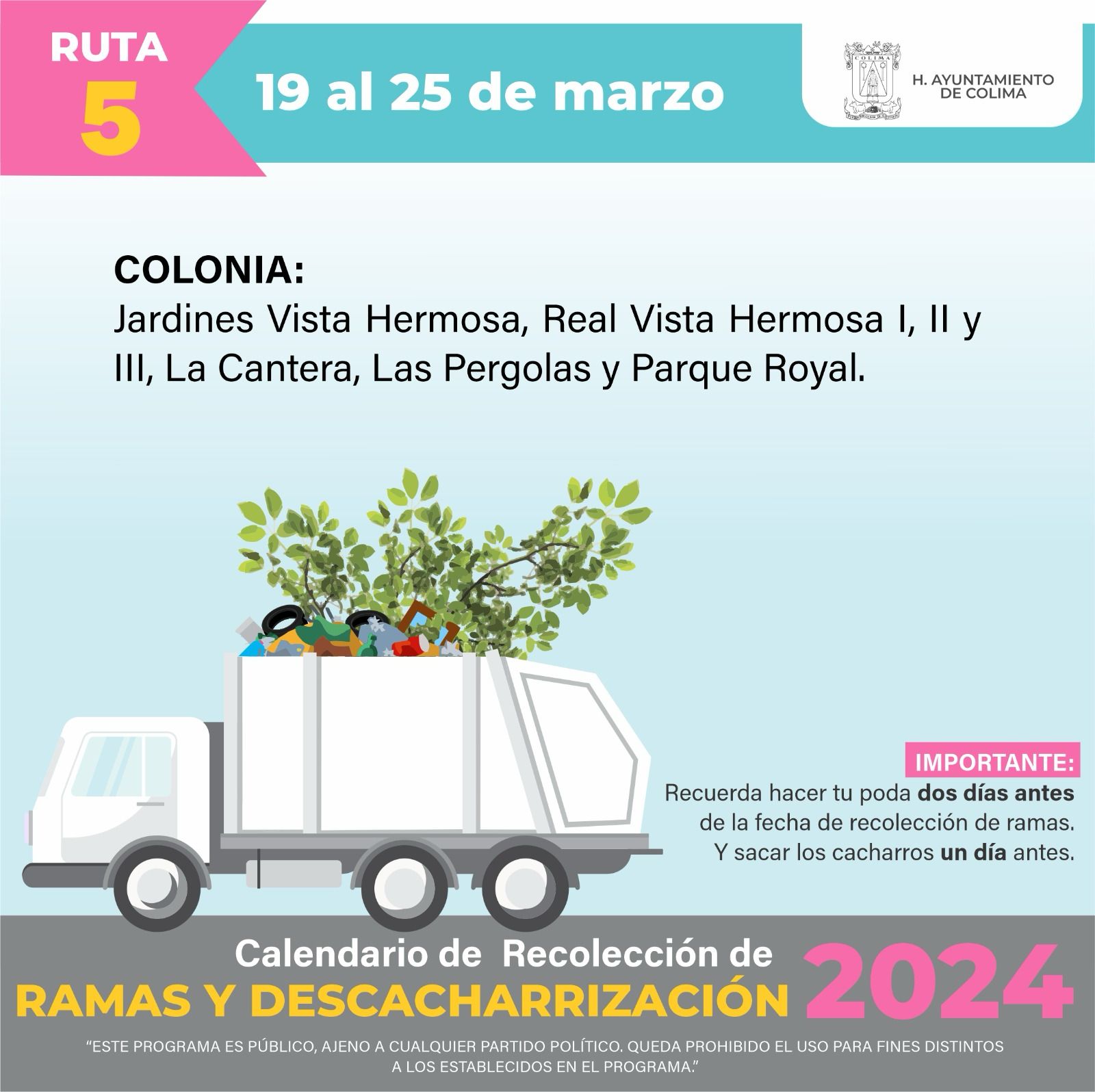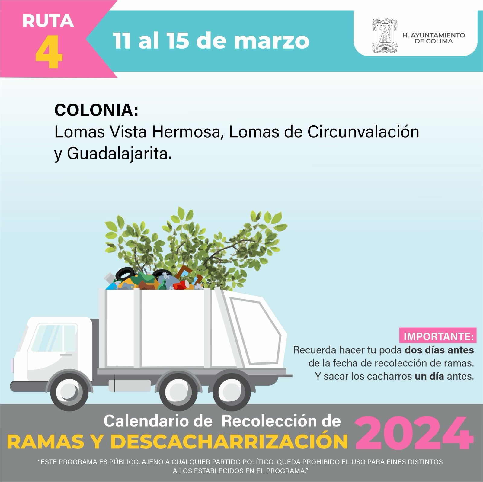El Ayuntamiento de Colima, a través de la dirección de Servicios Públicos, informa a la ciudadanía sobre el programa de recolección de ramas y cacharros que inició en el mes de febrero y concluirá en junio, con un total de 25 rutas definidas para atender la zona urbana y rural del municipio.