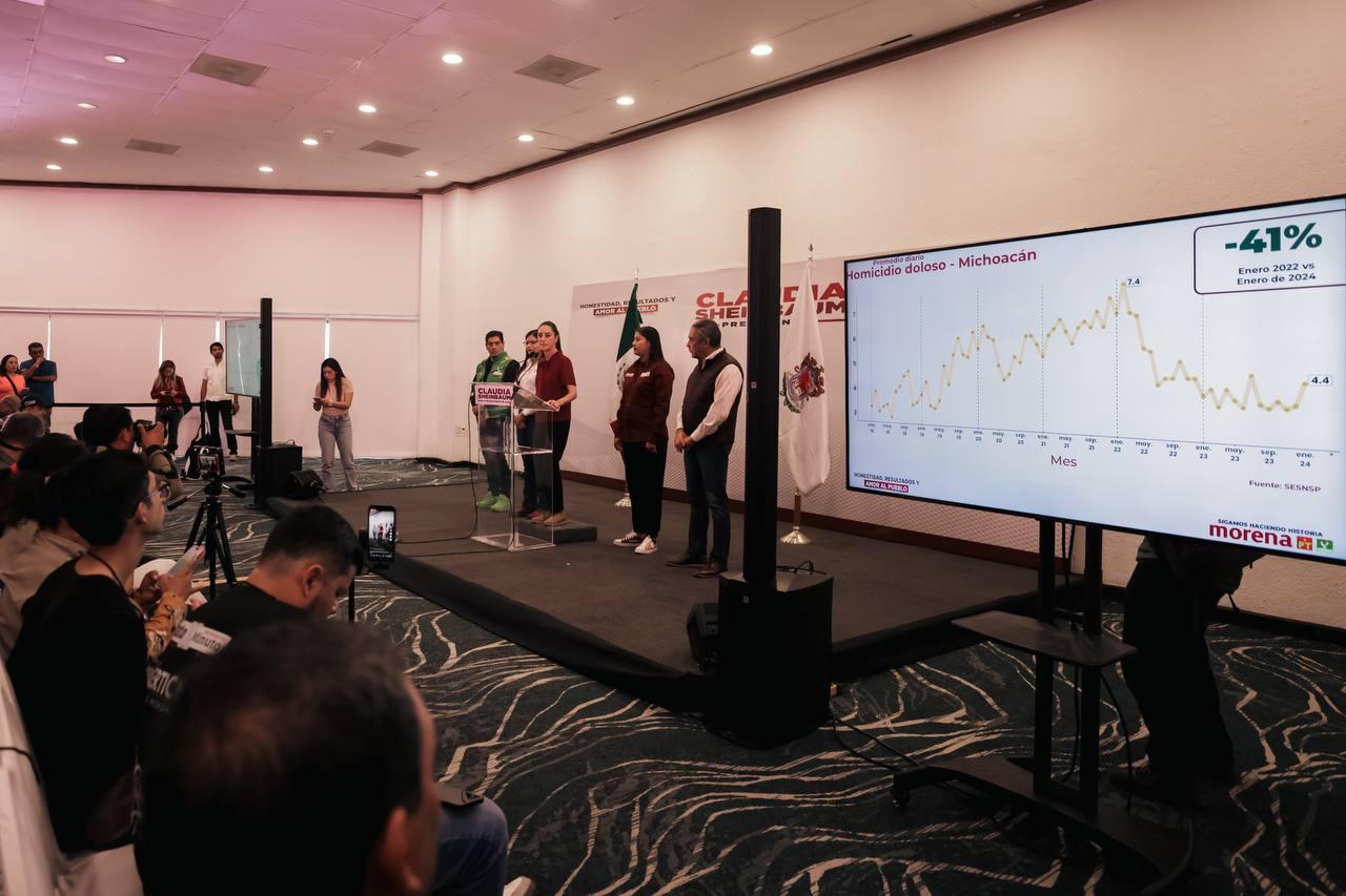’’No es un asunto de mano dura, de declaración de guerra como la que declaró Calderón aquí en Michoacán, — que es lo que nos tiene en esta circunstancia —-, sino es un asunto de justicia en el amplio sentido de la palabra, justicia para las los jóvenes, justicia para las mujeres’’, comentó. Claudia Sheinbaum hizo hincapié en que, gracias a la llegada del Presidente Andrés Manuel López Obrador hoy México es un país más seguro. ’’Si no hubiera llegado el Presidente Andrés Manuel López Obrador, la tendencia de homicidios hubiera seguido creciendo, o sea cambió la política, una política de justicia, ahora disminuye en 18 por ciento ¿Cuál es nuestro objetivo? que disminuya todavía más rápido y ya nos va a dejar el Presidente con una tendencia a la baja’’, explicó.