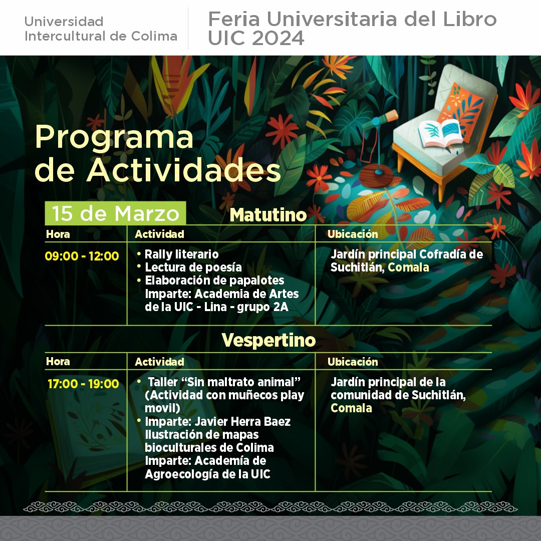Para este 15 de marzo, las actividades literarias y culturales de la Feria Universitaria del Libro serán de las 9:00 de la mañana a las 12:00 de la tarde, en los jardines principales de dos comunidades rurales de Comala, como son Suchitlán y Cofradía de Suchitlán.