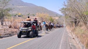 Los jinetes, a lomo de sus caballos y bestias mulares, salieron del crucero del Paso del Zarco para recorrer varios kilómetros por la carretera hasta llegar a la población de Tinajas, en donde se ofreció un recibimiento a la población en general y a los participantes en la cabalgata.