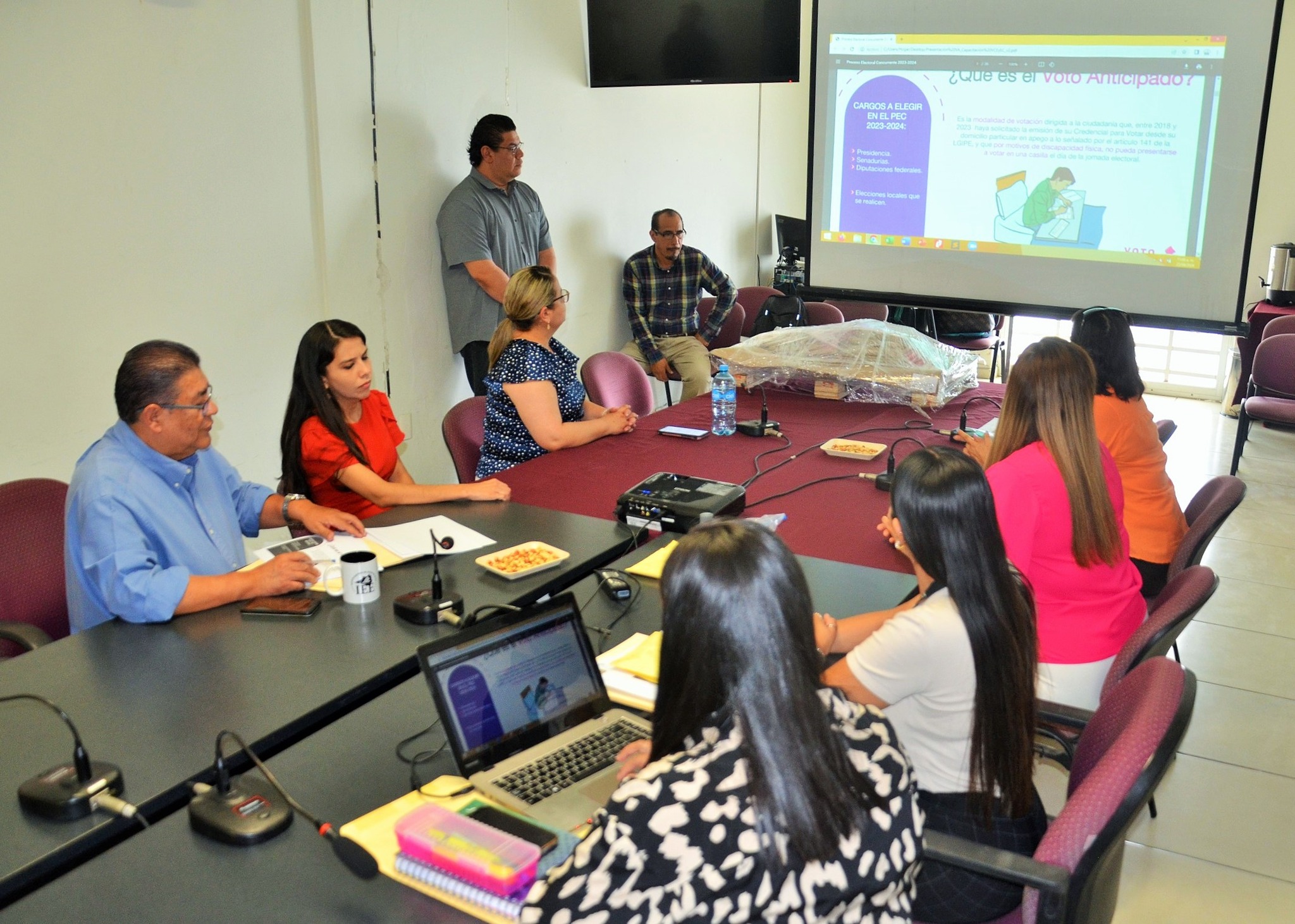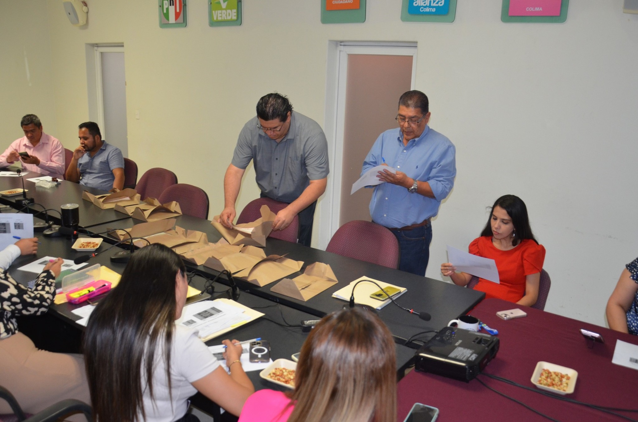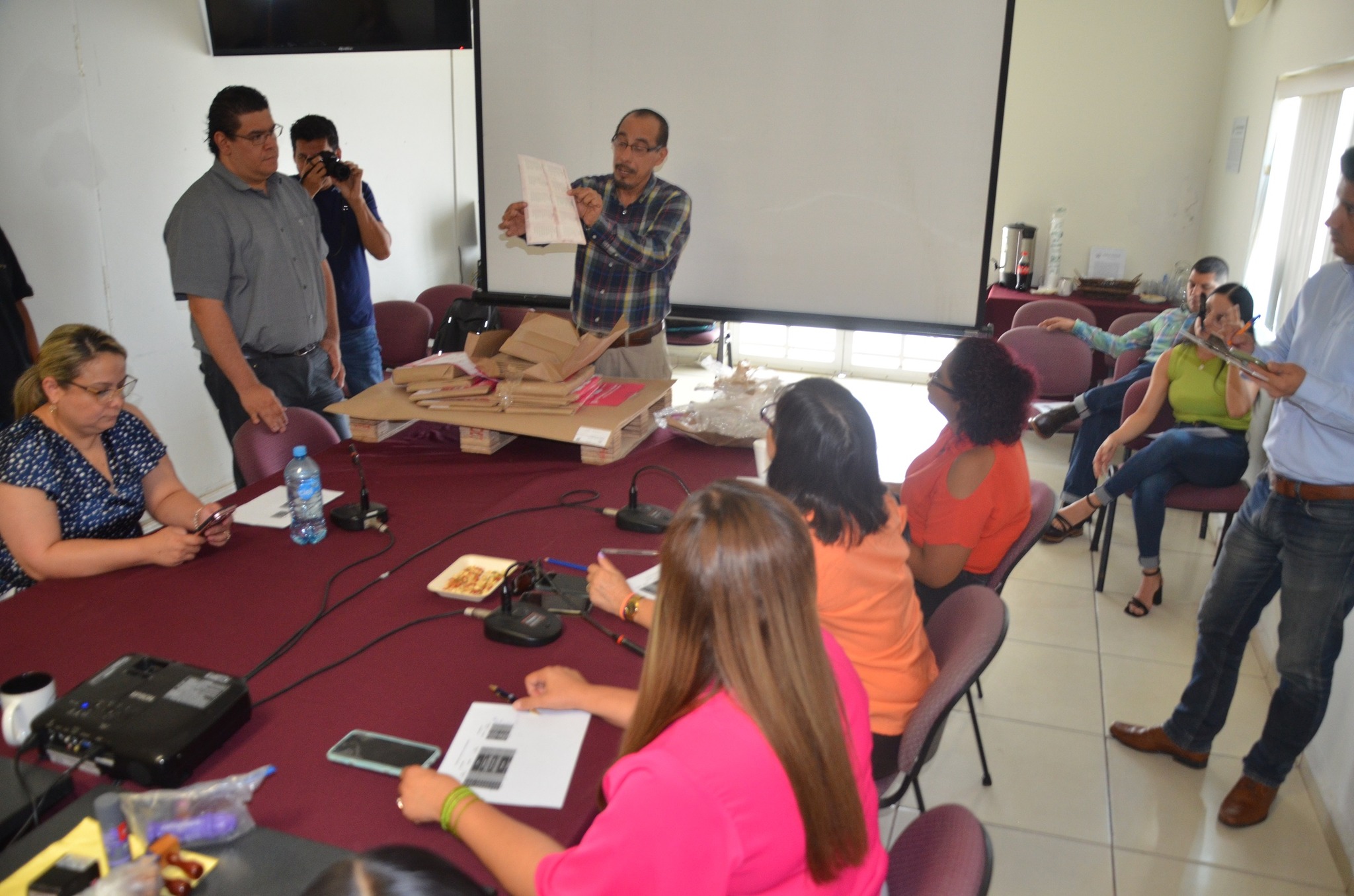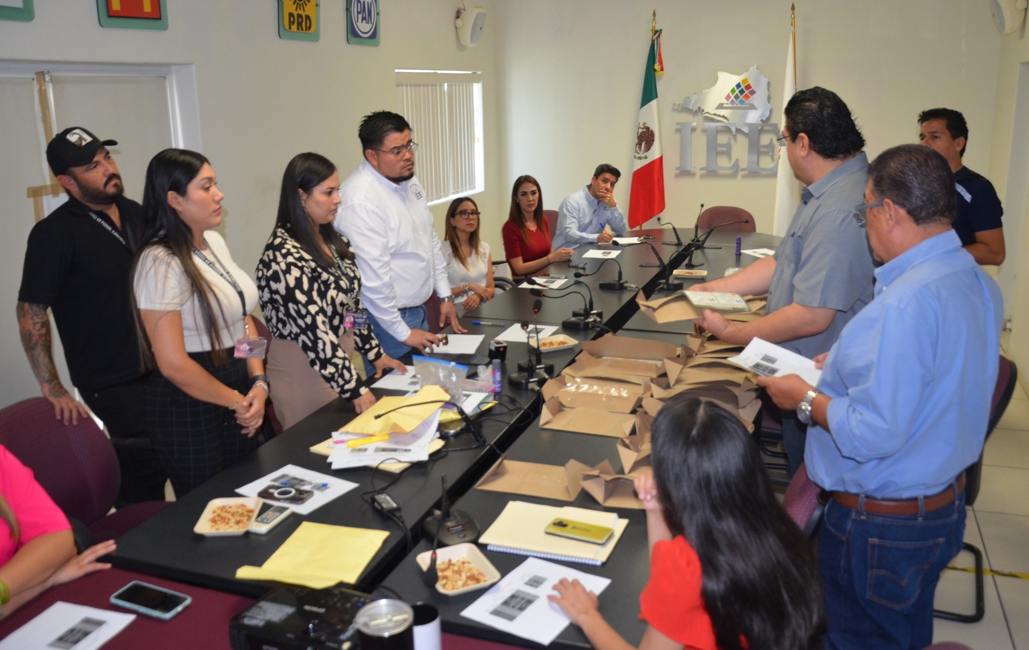 La Consejera Presidenta del #IEE, Adriana Ruiz Visfocri; y las Consejeras y Consejeros Electorales: Martha Iza, Arlen Martínez, Rosa Carrillo, Flor Romano, Juan Ramírez Ramos y Martín Dueñas; así como el Secretario Ejecutivo del Consejo General, Óscar Espinoza; representantes de partidos políticos, integrantes de Consejos Municipales Electorales y personal del Instituto; realizan el procedimiento establecido por la legislación en la materia.