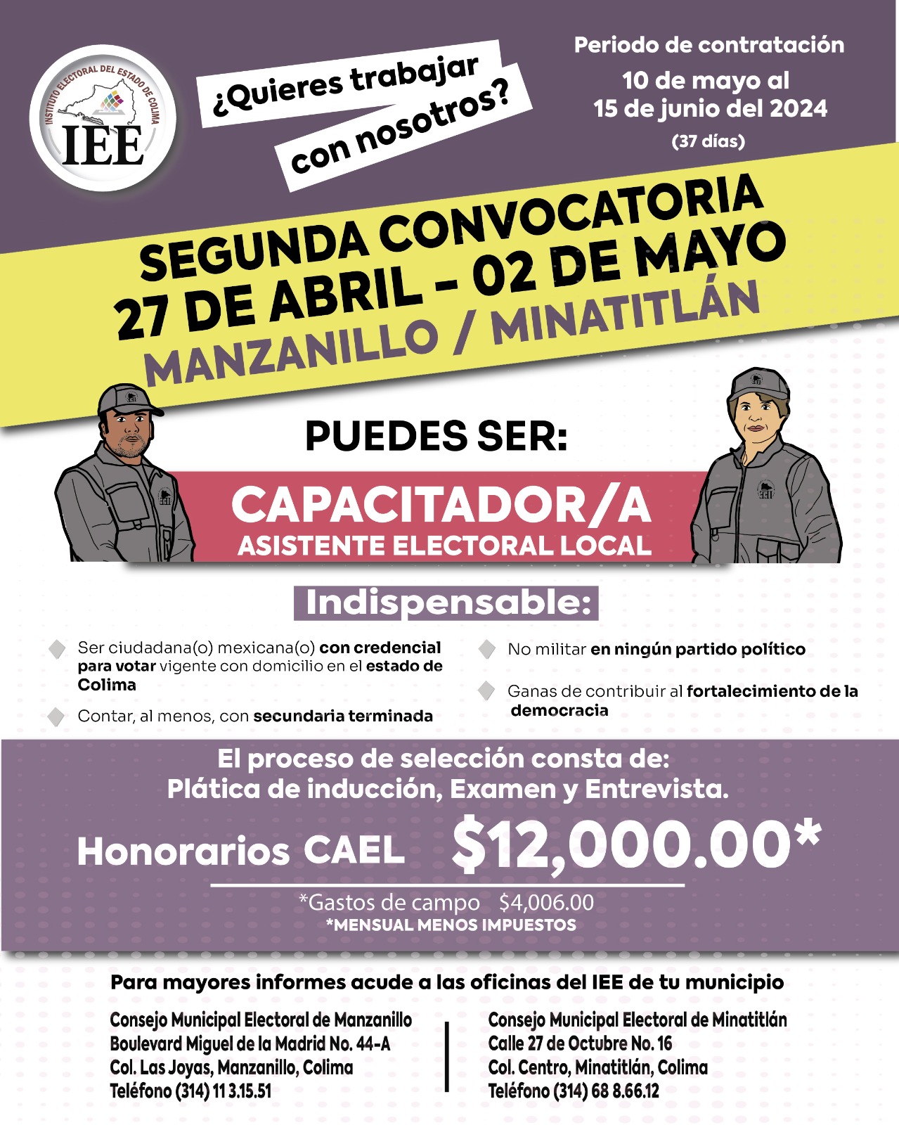 Por otro lado, debido a que de la primera convocatoria emitida por el Instituto para las personas interesadas en desempeñarse con SEL o CAEL se registran faltantes de personas en Manzanillo y Minatitlán, el Órgano Superior de Dirección aprobó una segunda convocatoria, la cual estará vigente del 27 de abril al 02 de mayo de 2024, y puede ser consultada también en www.ieecolima.org.mx