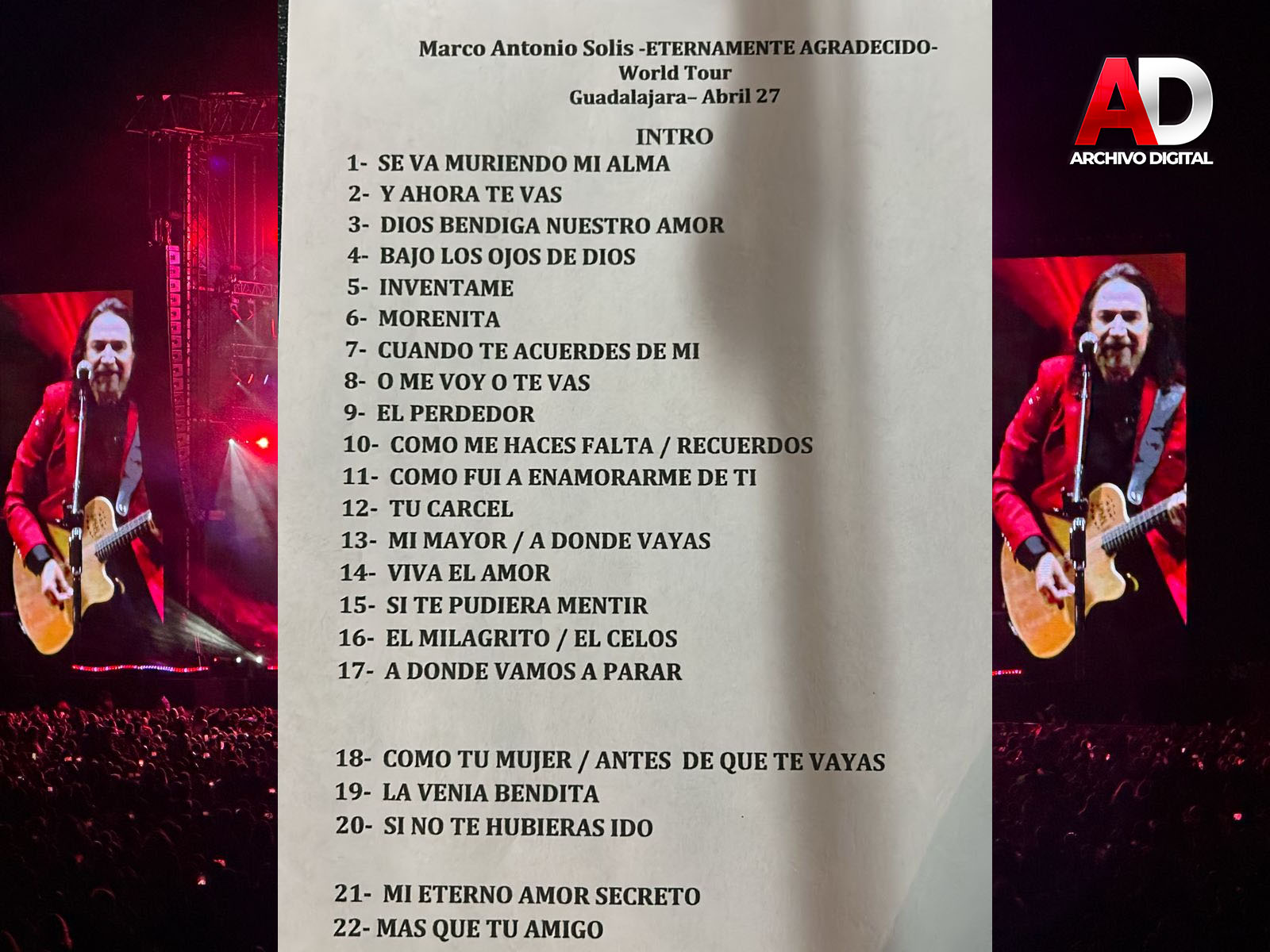 De va muriendo mi alma es el primer éxito que toca al iniciar su presentación la cual inicia 9:30 de la noche dentro del estadio 3 de marzo en Guadalajara.