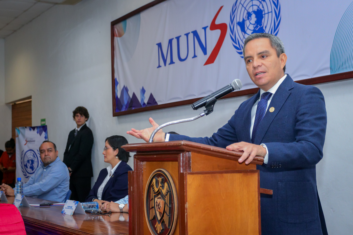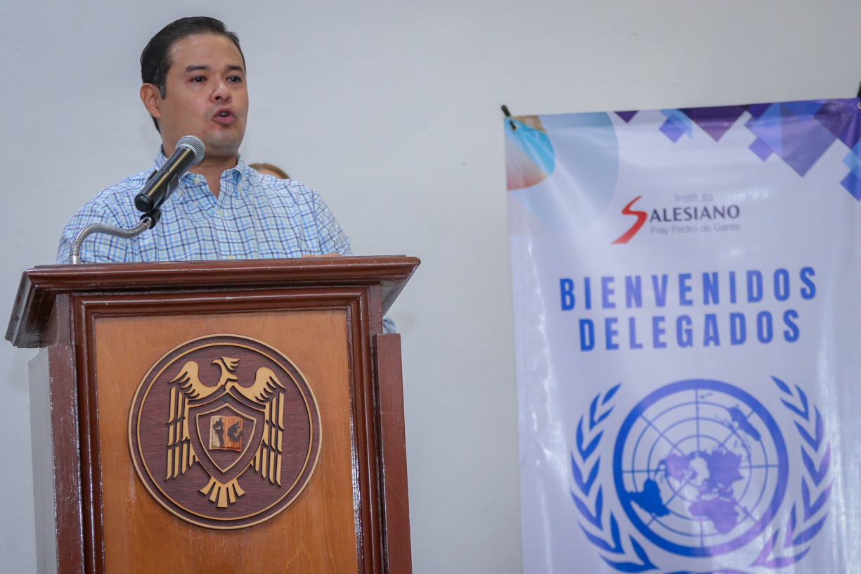 El rector de la Universidad de Colima, Christian Jorge Torres Ortiz Zermeño asistió como invitado especial este martes por la mañana, al arranque de actividades del Modelo de Naciones Unidas Salesiano 2024 realizado en Instalaciones del Archivo Histórico de esta casa de estudios.