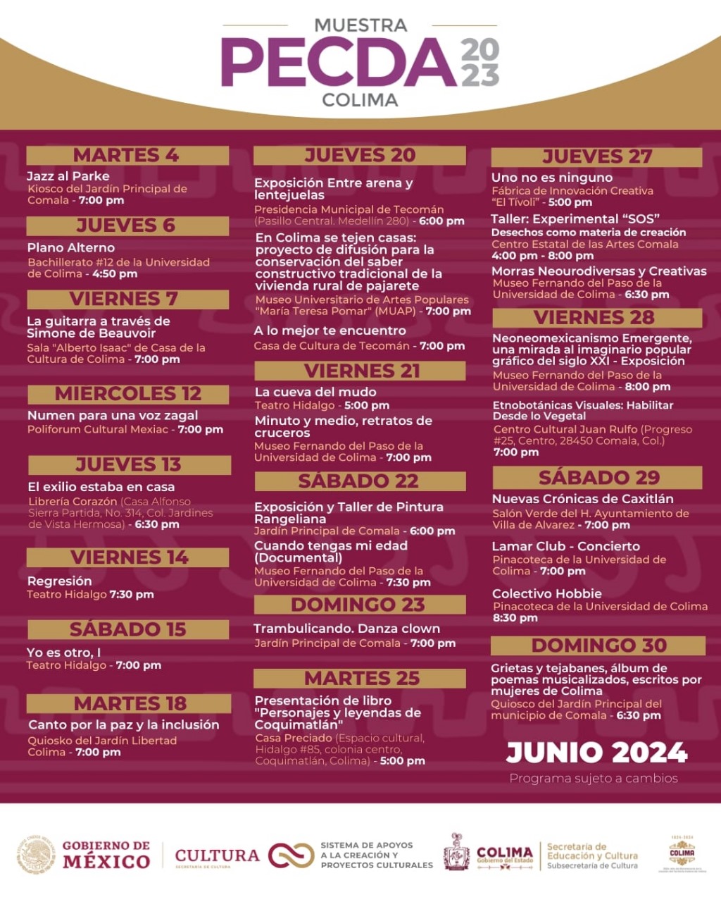 Para conocer la programación completa y mayores detalles de la Muestra PECDA que se estará realizando durante todo el presente mes de junio, se recomienda visitar la página oficial de Cultura Colima en Facebook: https://www.facebook.com/