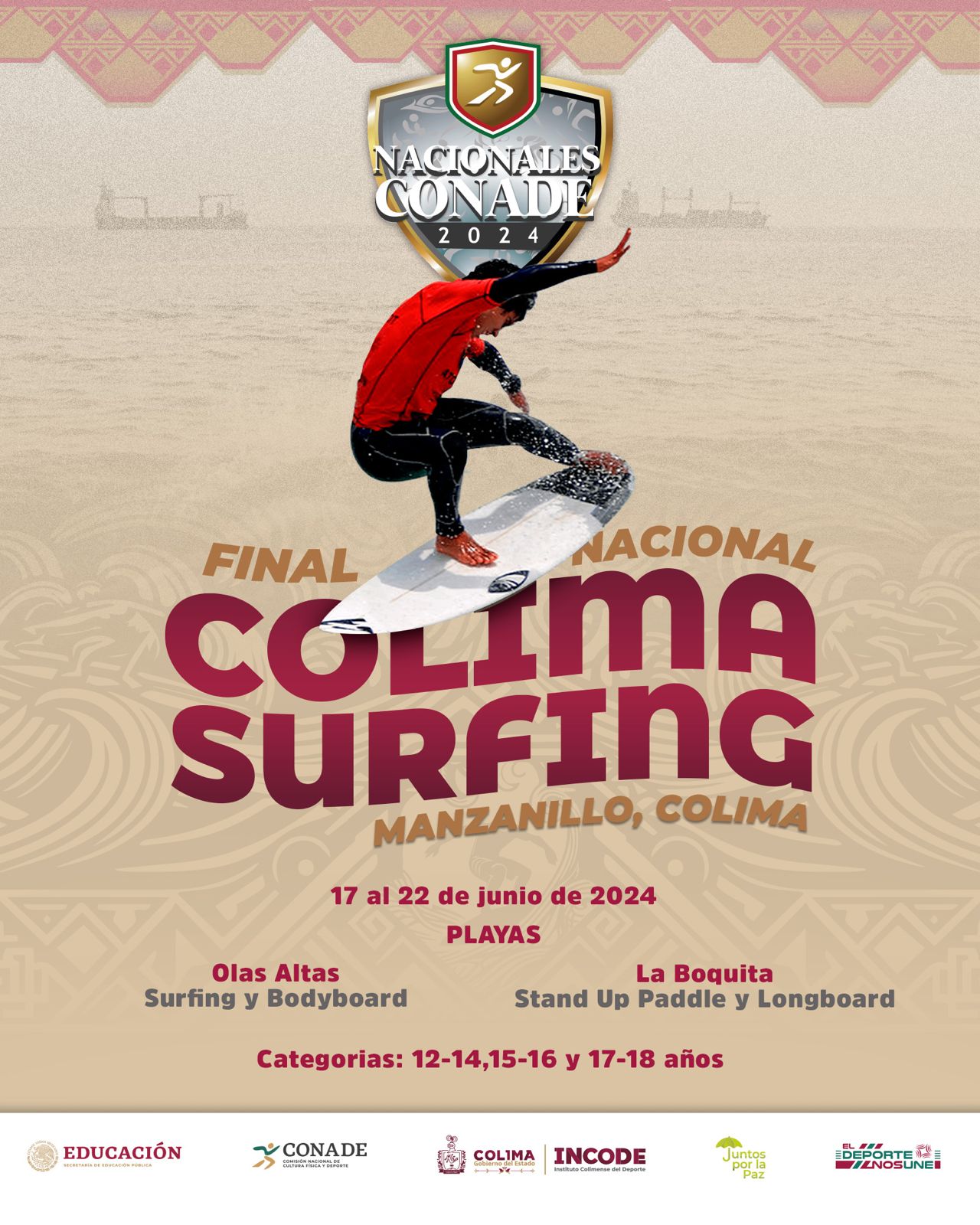 El presidente de la Asociación de Surfing del Estado de Colima, Carlos Antonio Bravo Sandoval, comentó que por segunda ocasión la entidad será sede del surfing de los Nacionales Conade del 18 al 21 de junio, en las modalidades de surfing, bodyboard, stand up paddle y el long board, a realizarse en las sedes de Olas Altas y La Boquita, en categorías 12-14 años, 15-16 años y 17-18 años tanto en rama femenil y varonil, con una participación de 250 surfistas de once estados del país, cien mujeres y 150 hombres.
