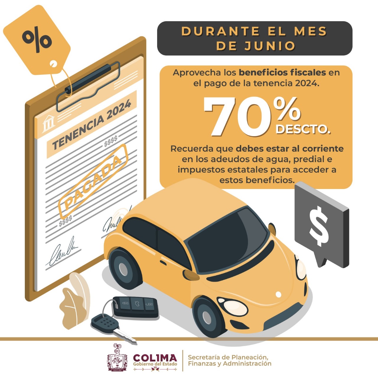 La Secretaría de Planeación, Finanzas y Administración (Seplafina) del Gobierno del Estado de Colima, hizo un llamado a las ciudadanas y ciudadanos colimenses, para aprovechar los beneficios fiscales temporales que vencen el próximo 30 de junio del presente año, que son los siguientes: