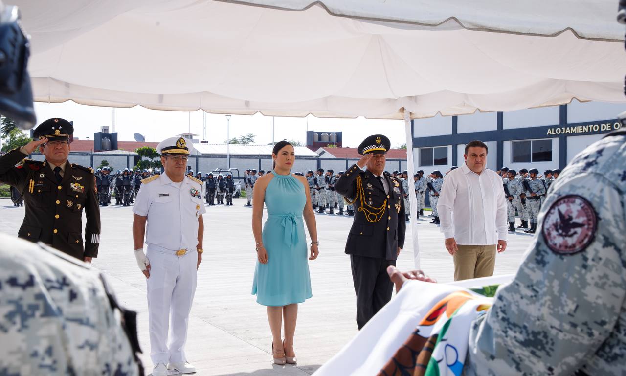 Tras un lustro, la GN se ha consolidado y actualmente tiene 32 coordinaciones estatales, 266 coordinaciones regionales, 401 cuarteles y más de 130 mil elementos, que le permiten tener un despliegue prácticamente en todo el territorio nacional “y desempeñar funciones fundamentales para la paz y bienestar del pueblo de México: desde atender cuestiones de seguridad pública hasta auxiliar a la población en emergencias; cuidar nuestras carreteras y todo lo que hacen con valentía, compromiso y honor”, expresó la mandataria estatal.