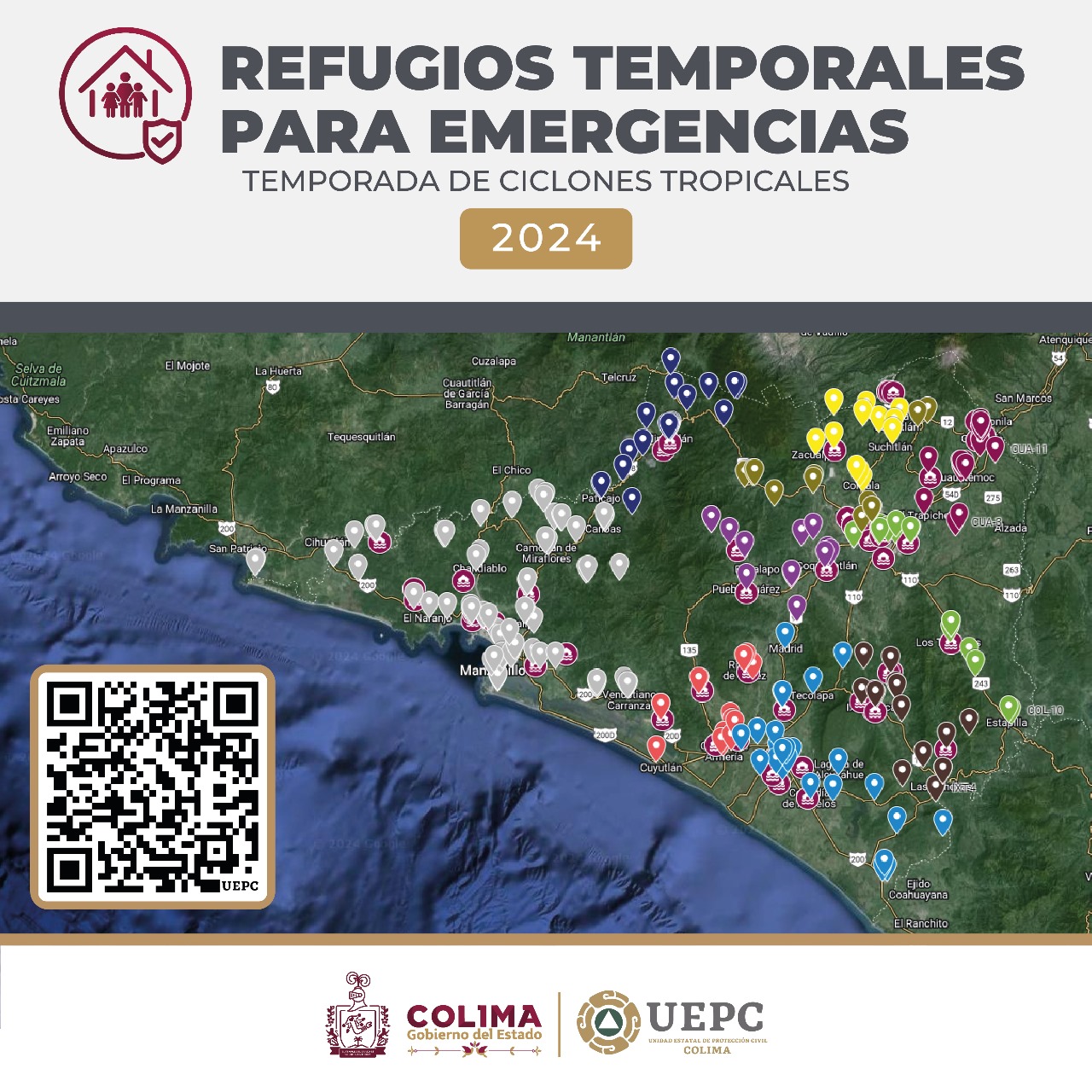 La población colimense puede identificar los refugios temporales ingresando al link https://www.google.com/maps/d/ viewer?mid=1q12od_ mG07yrMrgfbVfqNbEp94VzWbQ&hl= es-419&ll=19.162069763977318% 2C-104.11640898730357&z=8 .