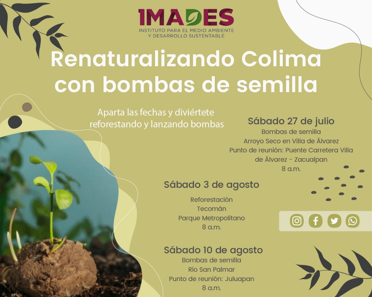 El Gobierno del Estado de Colima, a través del Instituto para el Medio Ambiente y Desarrollo Sustentable (Imades), invita a toda la población a participar en la campaña ‘Renaturalizando Colima con bombas de semilla’, con la cual se plantea restaurar los ecosistemas de los municipios de Villa de Álvarez, Comala y Tecomán.