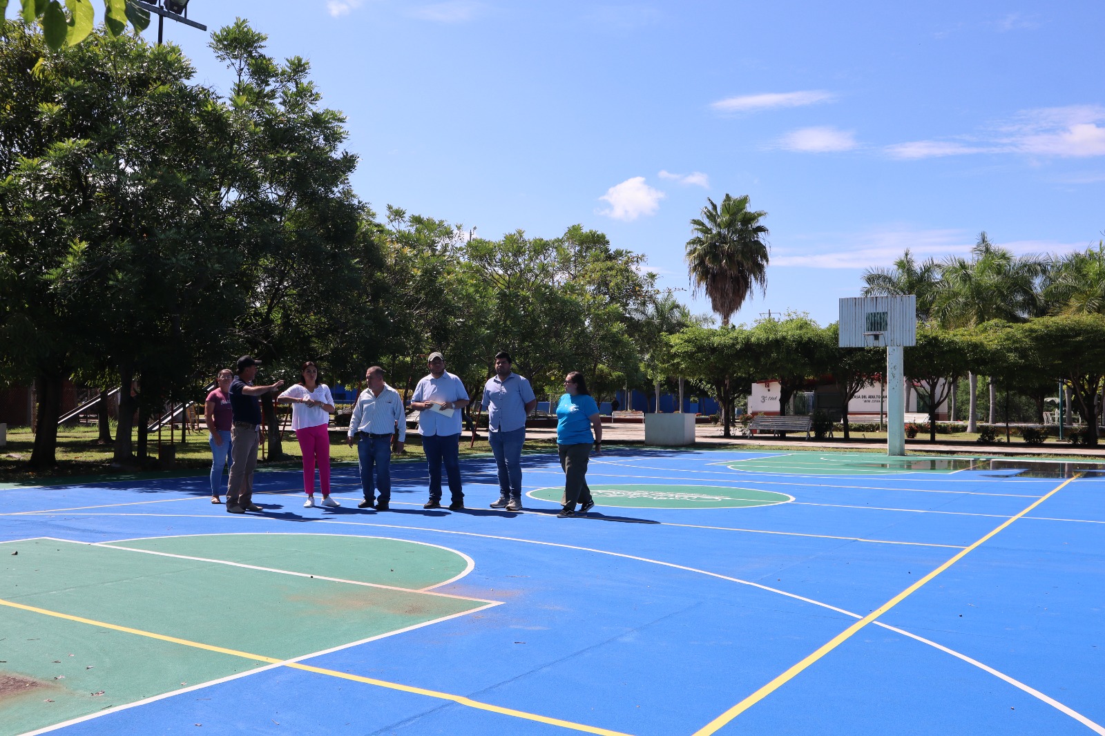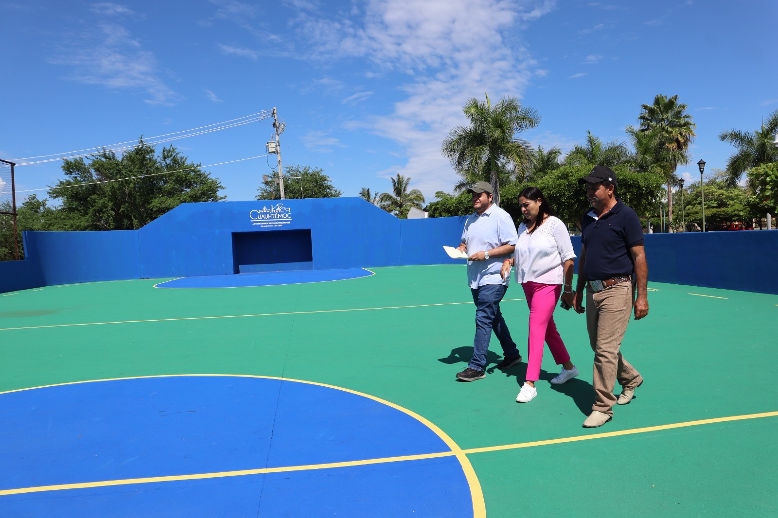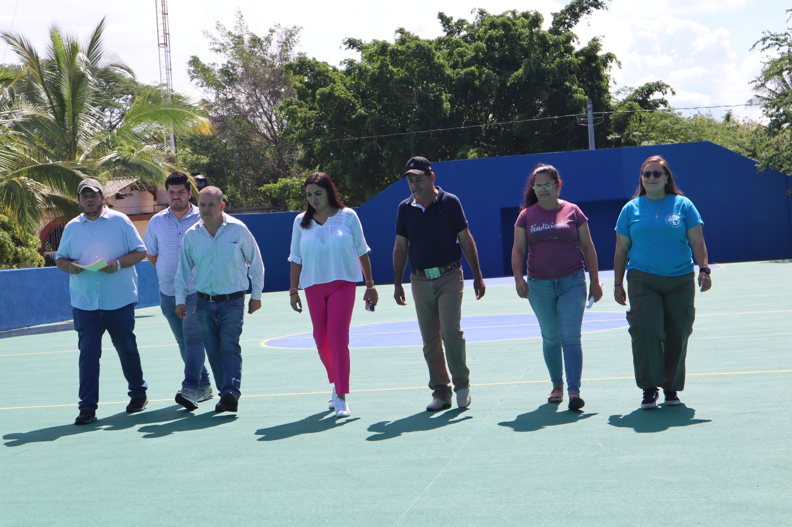 Acompañada por el secretario del Ayuntamiento, Aldo Martínez; el director de obra Pública, Mario Ceja, la regidora Xitlally Magaña y autoridades auxiliares, la alcaldesa visitó la comunidad de Buenavista, para verificar los avances en la remodelación de espacios deportivos y de recreación.