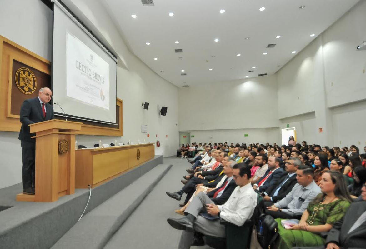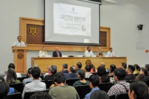 Llamó a su charla: “La ejemplaridad y currículum oculto del profesor universitario”. Este evento se llevó a cabo en el auditorio de la Facultad de Derecho y fue presidido por Christian Torres Ortiz Zermeño, rector de esta casa de estudios.