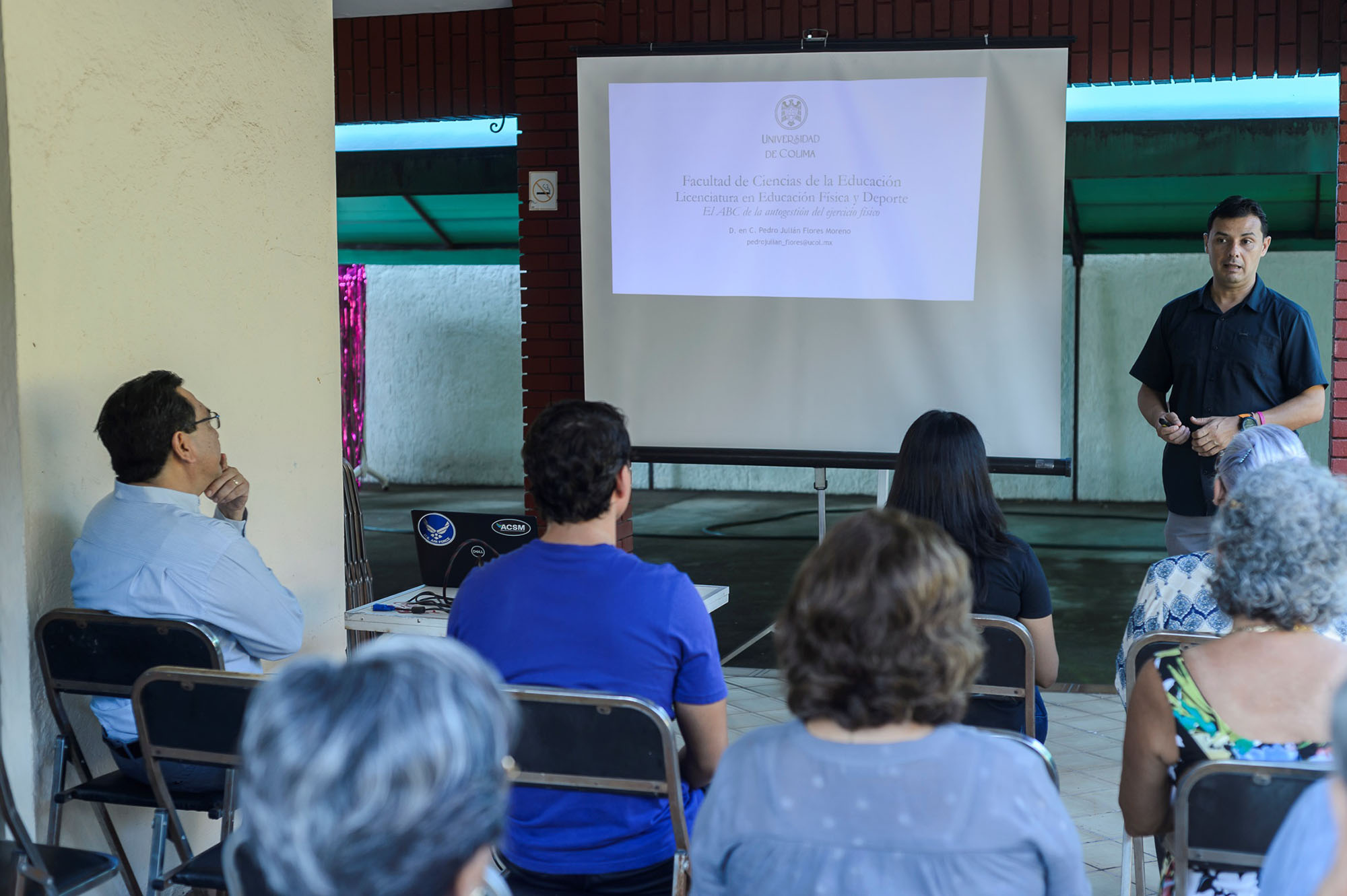 Integrantes de la Casa del Jubilados de la Universidad de Colima (UdeC) atendieron la charla “El ABC de la autogestión del ejercicio”, que impartió Pedro Julián Flores Moreno, investigador de la Facultad de Ciencias de la Educación; esto en el marco de la serie de charlas: “Mi vida con la ciencia”, que organiza la Coordinación General de Investigación de esta casa de estudios.