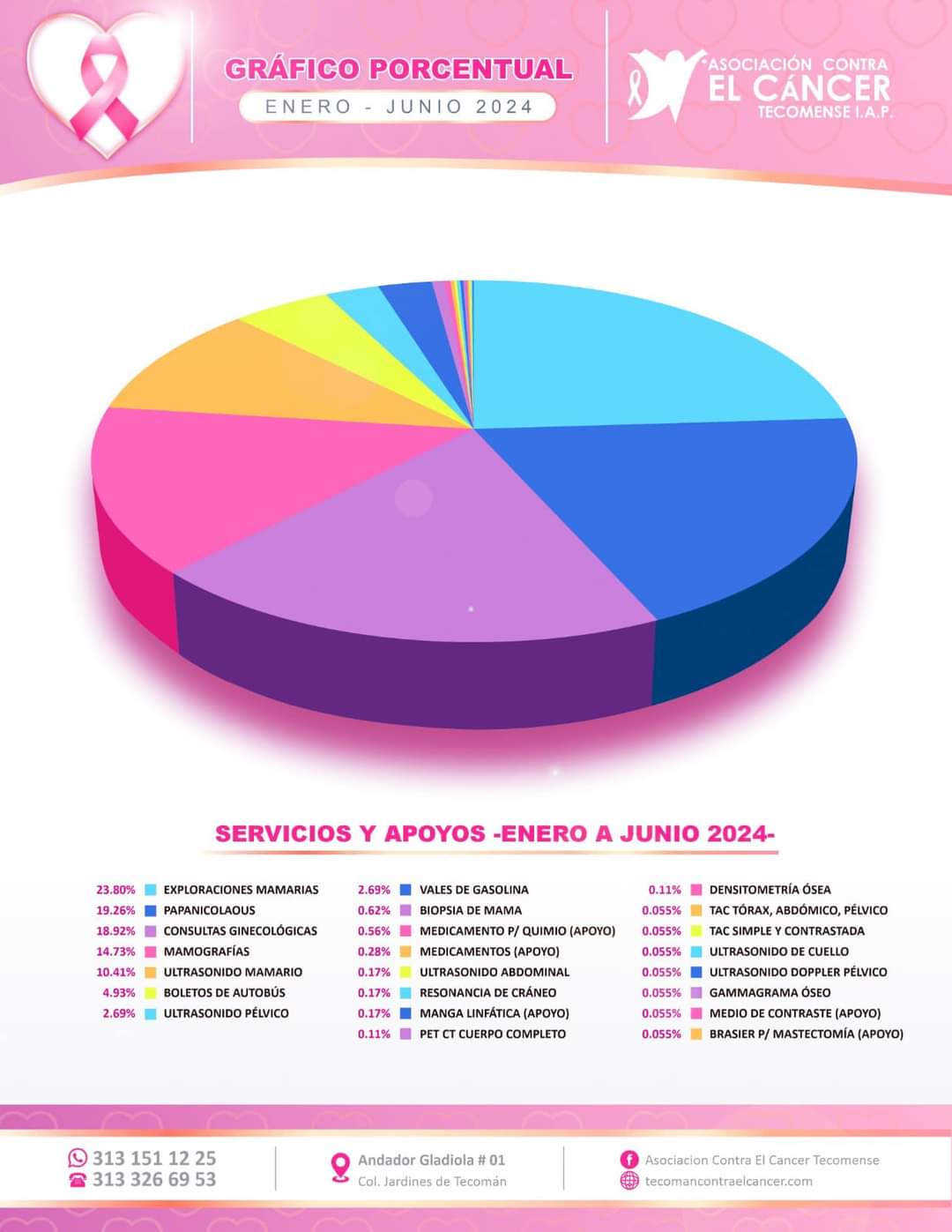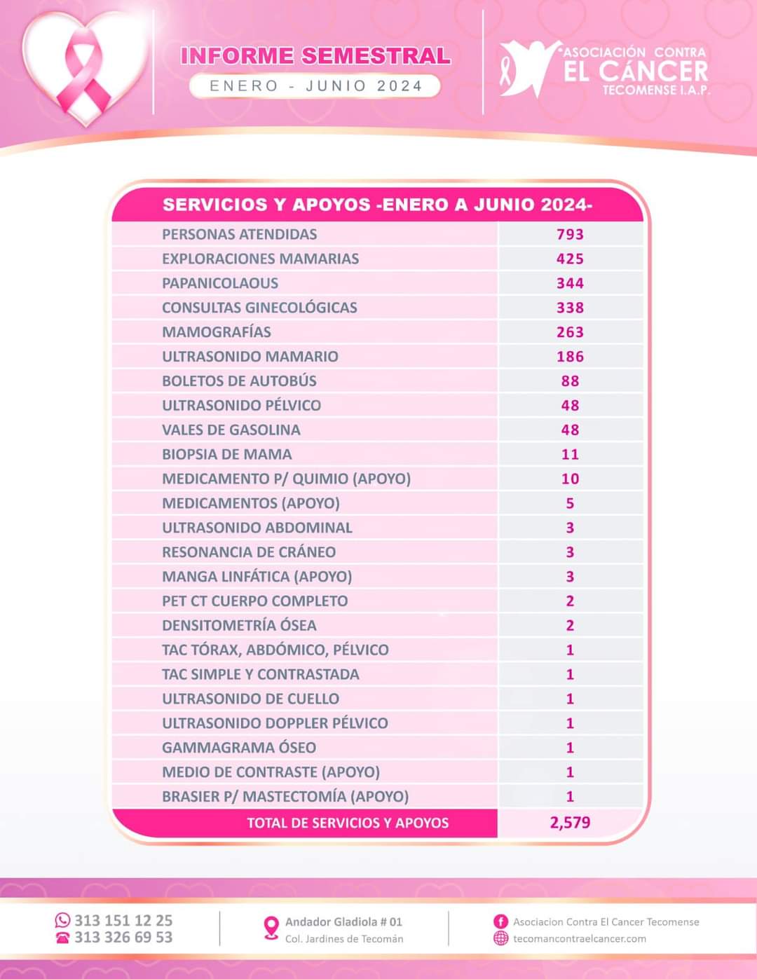 En cuanto a estudios específicos, se realizaron 263 mamografías, 186 ultrasonidos mamarios y se apoyó con 88 boletos de autobús y 48 ultrasonidos pélvicos, se proporcionaron 10 medicamentos para quimioterapia, 5 apoyos adicionales de medicamentos, y se llevaron a cabo diversas pruebas como resonancias, PET-CT y densitometrías óseas.