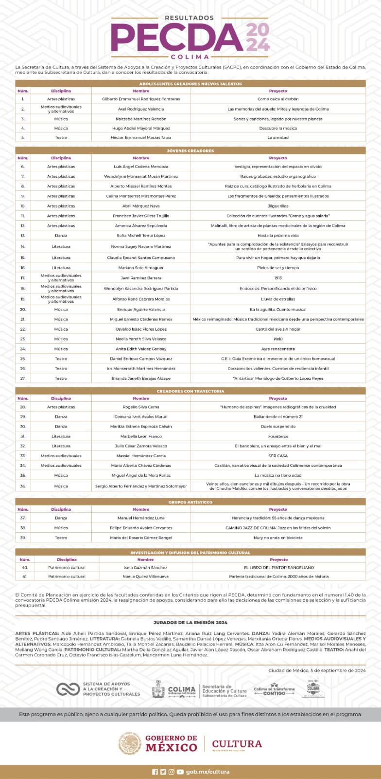 La lista completa de resultados puede ser consultada en el gráfico anexo y en las redes sociales oficiales de la Subsecretaría de Cultura: Cultura Colima en Facebook y cultura.colima en Instagram.