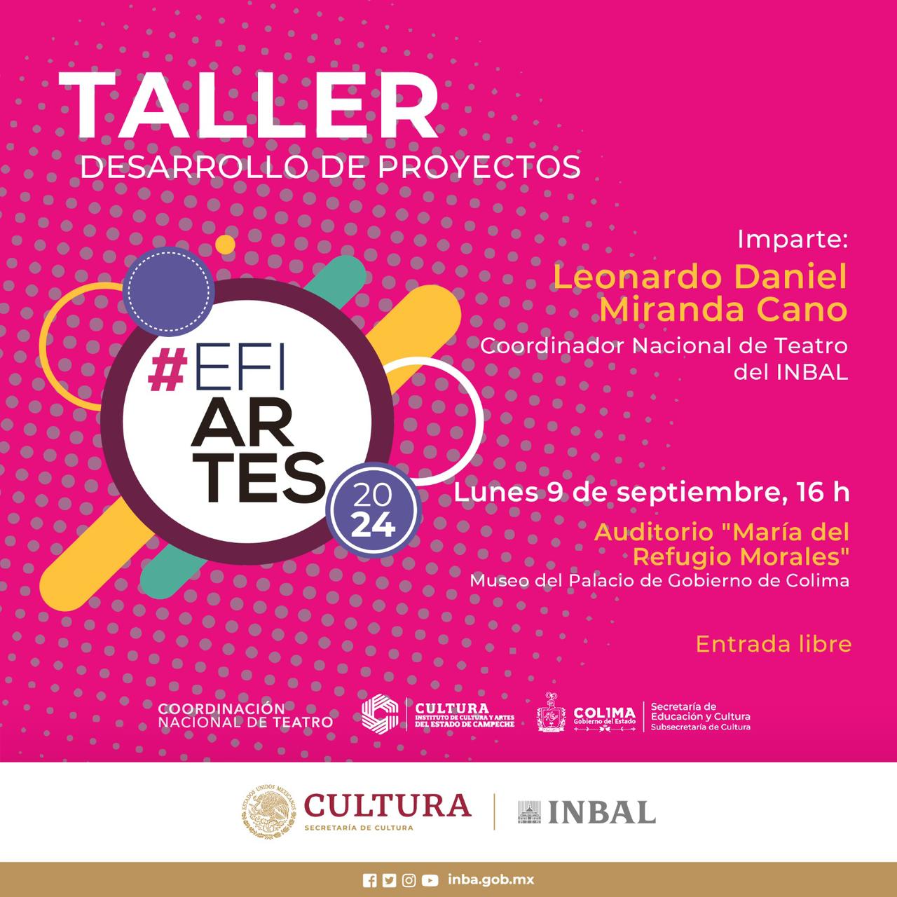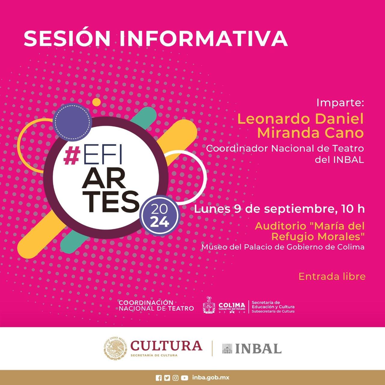 La Subsecretaría de Cultura del Gobierno del Estado de Colima, en coordinación con la Secretaría de Cultura del Gobierno de México, a través del Instituto Nacional de Bellas Artes y Literatura, convocan al sector empresarial y artistas colimenses a las sesiones informativas y de capacitación para conocer las reglas generales del Efiartes y lograr una sinergia entre la comunidad artística e iniciativa privada, que permita realizar obras y proyectos artístico-culturales en la entidad.