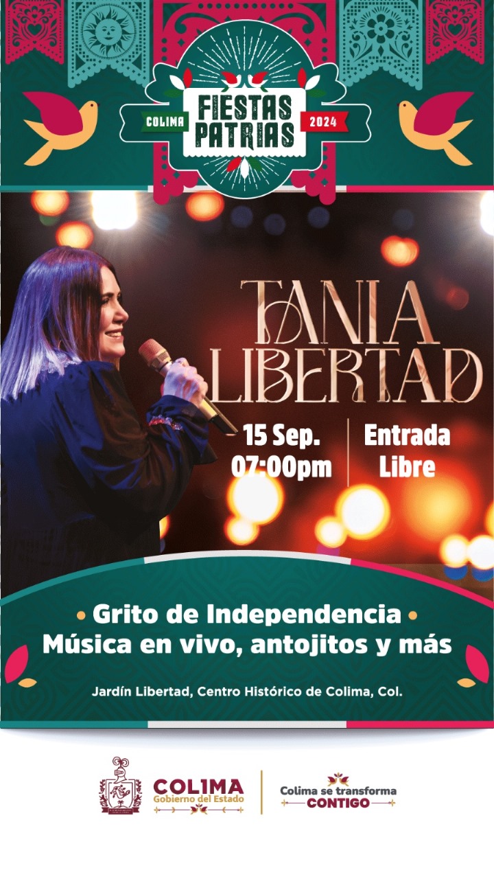 La tarde de este miércoles, la gobernadora Indira Vizcaíno Silva, anunció en Diálogos por la Transformación, que la noche del domingo 15 de septiembre, la cantante Tania Libertad ofrecerá un concierto gratuito en el Centro Histórico de la capital del estado, para celebrar con las y los colimenses, luego de la ceremonia oficial del Grito de Independencia.