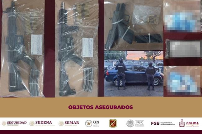 La Secretaría de Seguridad Pública (SSP) del Gobierno del Estado de Colima dio a conocer que, como resultado de las estrategias implementadas para prevenir y combatir hechos delictivos en la entidad, elementos de la Policía Estatal Preventiva (PEP), en colaboración con la Secretaría de Marina Armada de México (Semar), detuvieron en la carretera Colima-Coquimatlán a dos personas, por violación a la Ley Federal de Armas de Fuego y Explosivos, y delitos contra la salud.