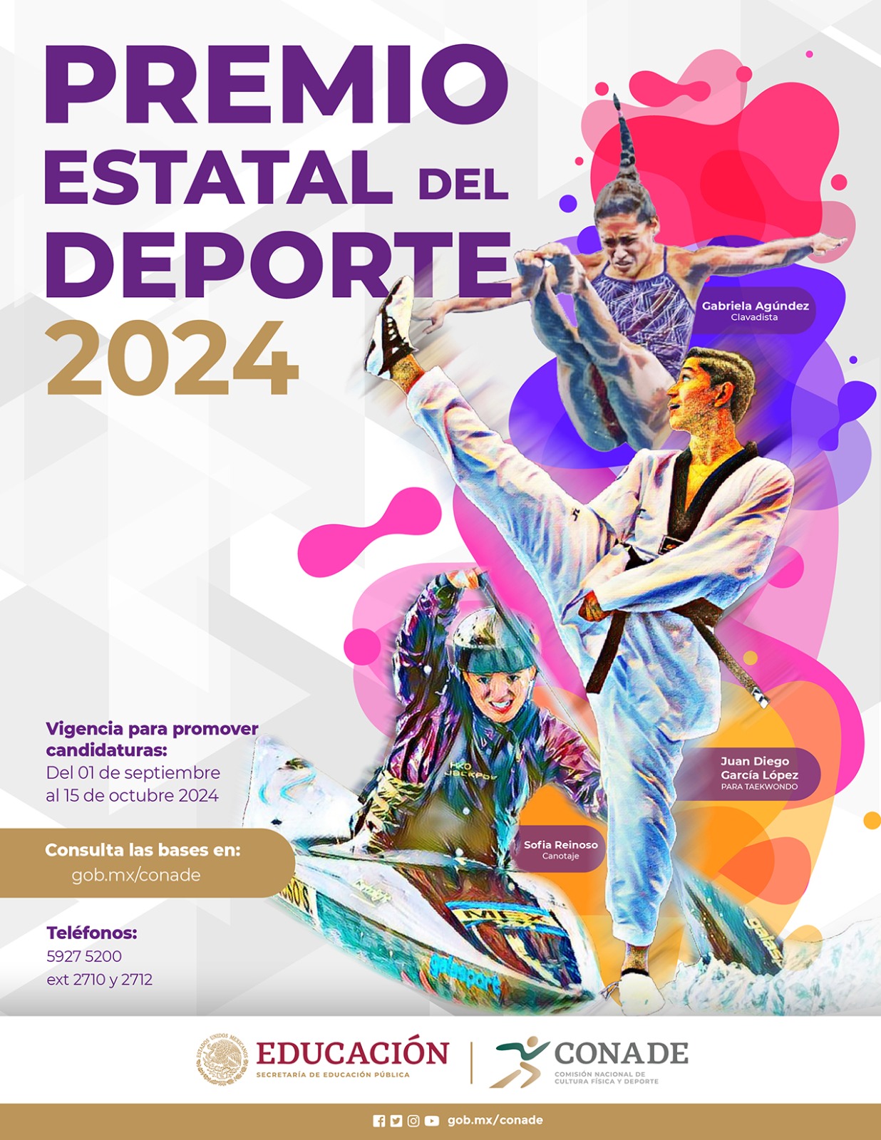 El Premio Estatal del Deporte convoca a asociaciones y sociedades deportivas, a proponer a las y los deportistas y entrenadores del deporte convencional y adaptado que, hayan destacado por sus logros durante el periodo del 11 de octubre de 2023 al 11 de octubre de 2024, otorgando un premio de 110 mil pesos y medalla conmemorativa para la o el ganador; las candidaturas deberán ser presentadas en el Incode a partir de la publicación de la convocatoria y hasta las 14:00 horas del 15 de octubre de 2024.