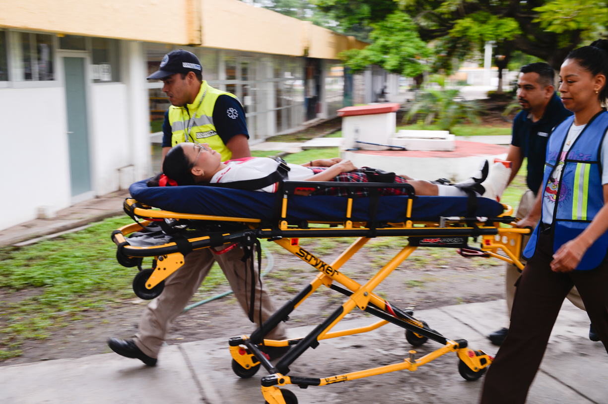 En este primer simulacro, las y los alumnos que salieron más rápido de sus salones lo hicieron en 34 segundos y los que tardaron más en 54. Se ejecutó la hipótesis de tres personas lastimadas, a las que primero atendió personal de la Brigada de Protección Civil de la UdeC, entablillándolas, y posteriormente se llamó a una ambulancia para completar el ejercicio.