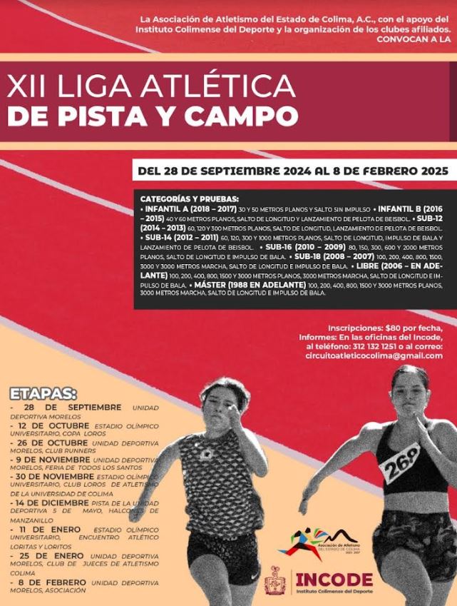 Con el apoyo del Instituto Colimense del Deporte (Incode), la Asociación de Atletismo del Estado de Colima, en conjunto con clubes afiliados a la asociación, convocan a la XII Liga Atlética de Pista y Campo 2024 y a la II Liga Atlética de Campo Traviesa 2024 que iniciarán sus etapas este 28 y 29 de septiembre, con el objetivo de fomentar y fortalecer el atletismo en las infancias y juventudes colimenses, señaló Alejandro Rodríguez Alvarado, director del Incode.