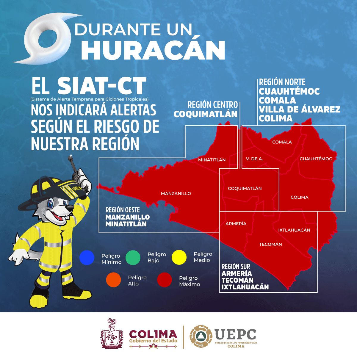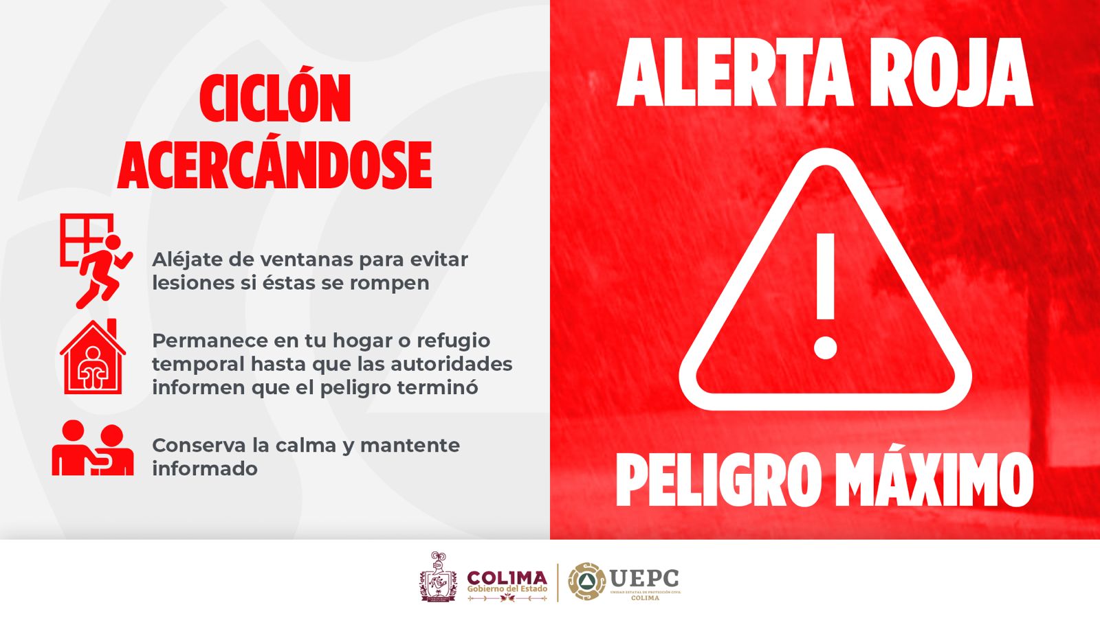 La Unidad Estatal de Protección Civil (UEPC) del Gobierno del Estado de Colima, exhortó a la población a permanecer en sus hogares y/o refugios temporales, así como a mantenerse informados acerca de la evolución de este fenómeno hidrometeorológico, a través de los canales oficiales y medios de comunicación reconocidos.