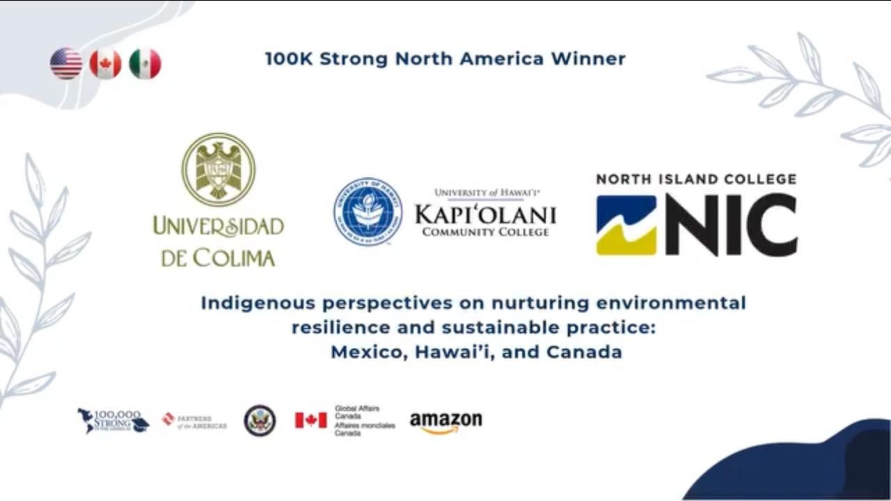 El proyecto “Perspectivas indígenas sobre el fomento de la resiliencia ambiental y las prácticas sostenibles”, coordinado por la Universidad de Colima, el Kapiʻolani Community College de Estados Unidos y el North Island College de Canadá, es uno de los ocho equipos ganadores de la convocatoria 100K Strong North América, que recibirán 25 mil dólares para realizar intercambios estudiantiles inclusivos y enfocados en el clima.