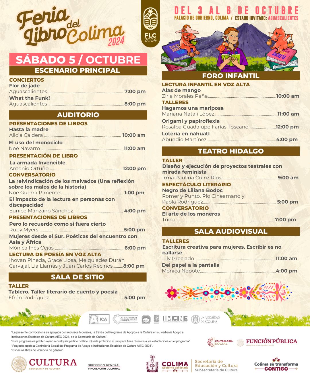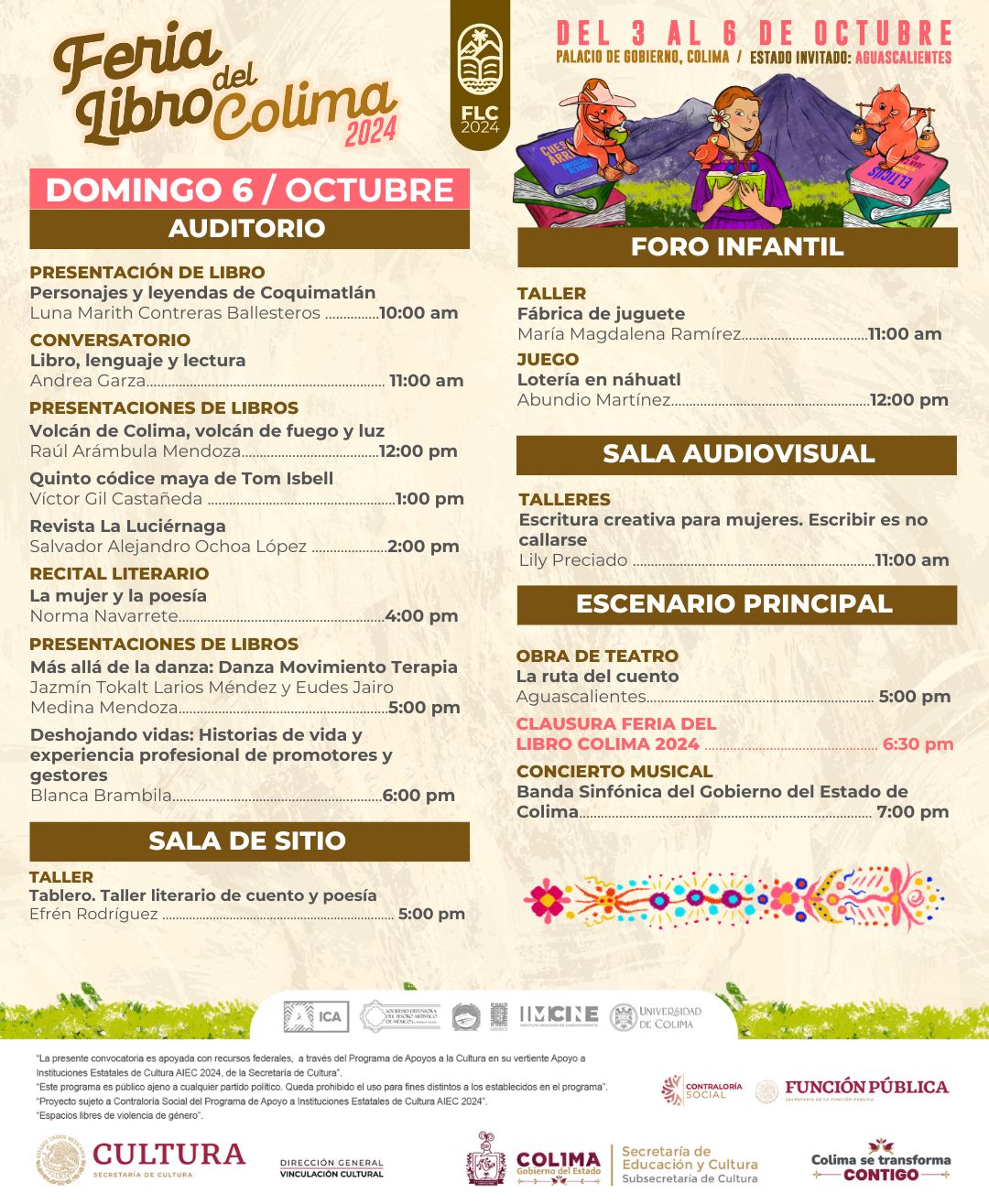Mientras que el domingo 6 de octubre, se presentarán los libros ‘Quinto Códice Maya de Tom Isbell’ de Víctor Gil Castañeda, ‘Volcán de Colima, volcán de fuego y luz’ de Raúl Arámbula Mendoza y la Revista ‘La Luciérnaga’. Las infancias podrán disfrutar de la obra de teatro ‘La ruta del cuento’ en el escenario principal y las familias enteras del concierto de la Banda Sinfónica del Gobierno del Estado de Colima. También se impartirán talleres de escritura creativa a cargo de las escritoras Mónica Nepote, Lily Preciado y el poeta colimense Efrén Rodríguez.