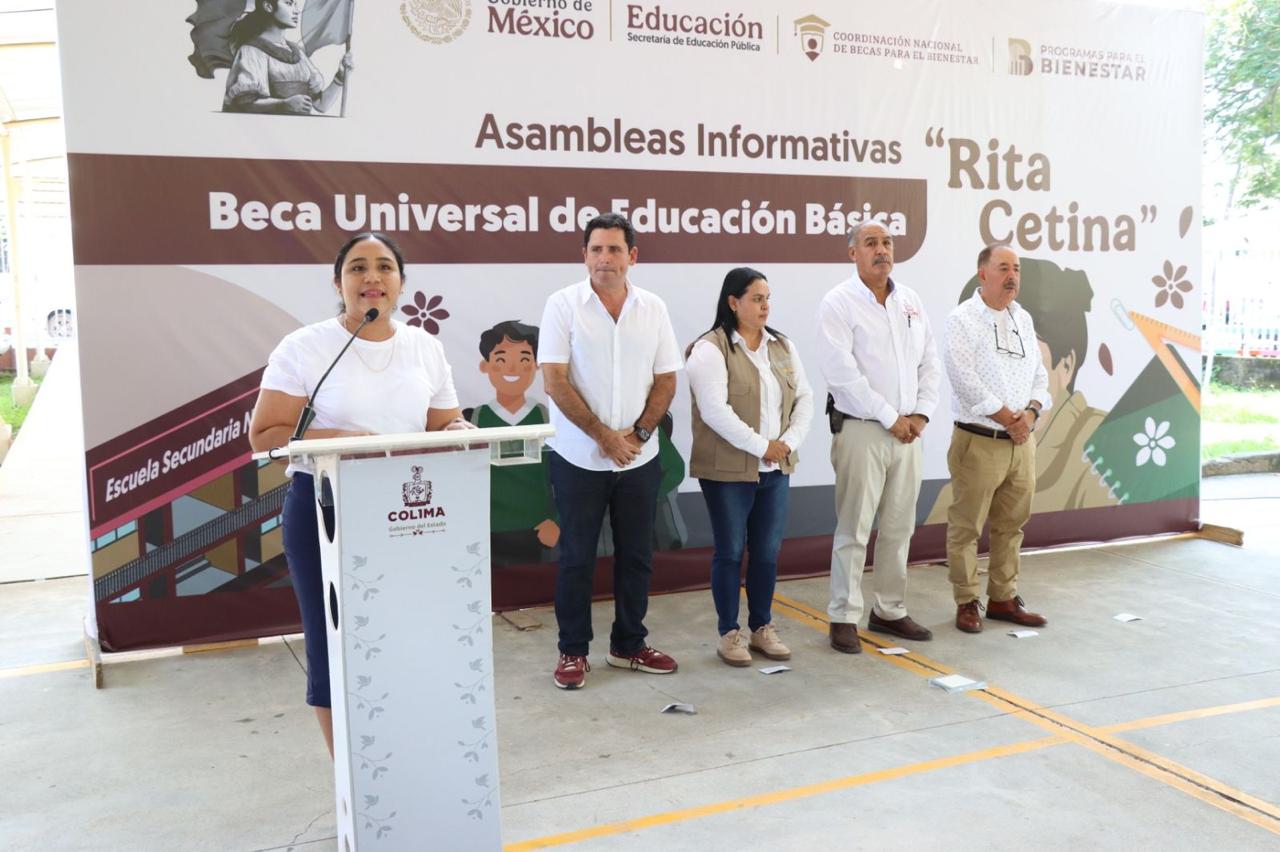 El secretario de Educación y Cultura del Gobierno del Estado de Colima, Adolfo Núñez González, y la delegada de Programas para el Bienestar en la entidad, Rosario Silva Verduzco, encabezaron este lunes la asamblea informativa dirigida a estudiantes, docentes, madres y padres de familia, para dar a conocer los detalles de las becas universales de Educación Básica ‘Rita Cetina’.