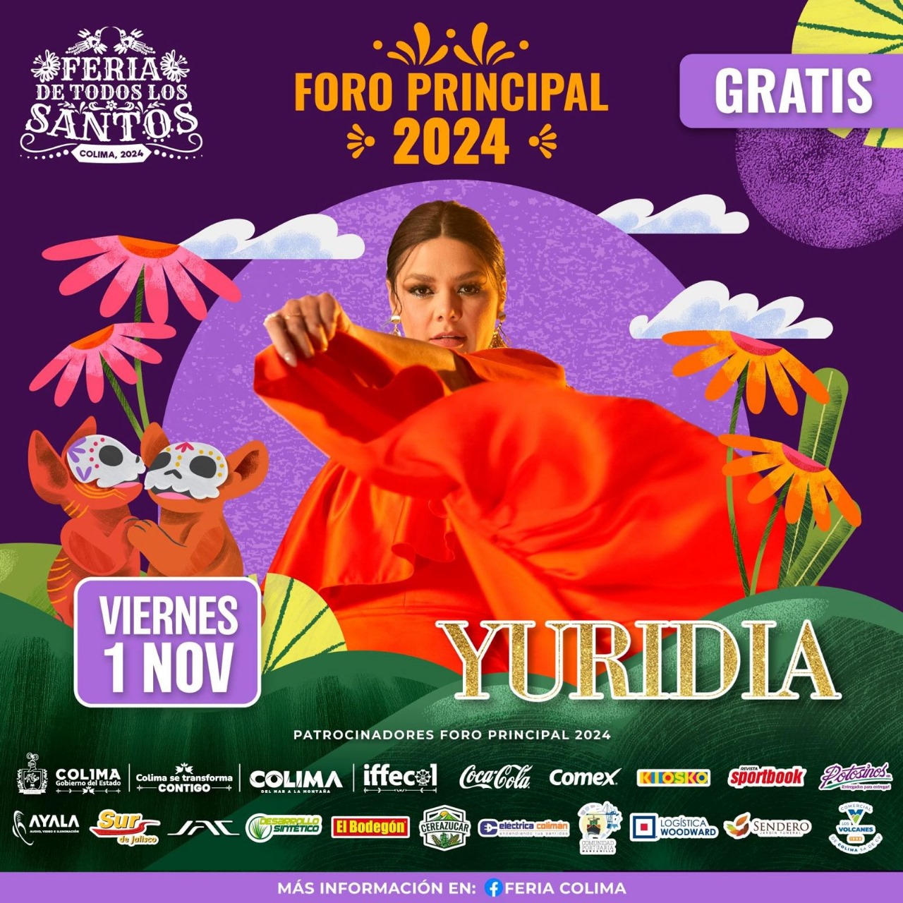 Hoy viernes 1 de noviembre, la cantante Yuridia, intérprete de temas como ’Ya te olvidé’ y de ‘Amigos no por favor’, abre esta noche la serie de seis conciertos gratuitos de diferentes artistas, que el Gobierno del Estado de Colima ofrecerá a la población en el Foro Principal de la Feria de Todos los Santos 2024, informó el director general del Instituto de Fomento de Ferias y Exposiciones del Estado de Colima (Iffecol), Rodolfo Aguilar Dávalos.